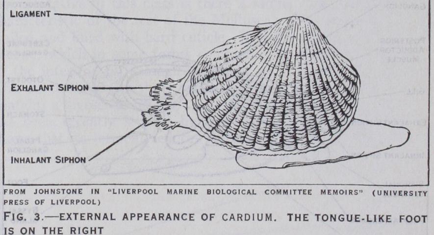 LAMELLIBRANCHIA, a group of aquatic invertebrate animals forming a class of the phylum Mollusca (q.v.). The most familiar examples of these animals are the oyster, the mussel and the cockle, and these popular names are sometimes given to various families and genera of the class. The name "bivalves" is also applied to these animals and a certain number of them are called "clams." The majority of the Lamellibranchia live in the sea, but a few families of the group have penetrated into brackish and fresh water. They are internally and externally symmetrical and are distinguished from other Mol lusca by the possession of a shell formed in two pieces (valves) which are articulated together by a system of interlocking teeth and joined in addition by a tough, cuticular ligament. They are fur ther distinguished by the rudi mentary development of the head and the presence of two symmetrical gills which are subject to very complex modification and, in addition to their normal respira tory function, play an important part in the process of feeding. The foot is usually well developed and modified for burrowing in sand and mud, and in many cases it secretes a tuft of adhesive threads (the byssus) by which the animal can anchor itself.