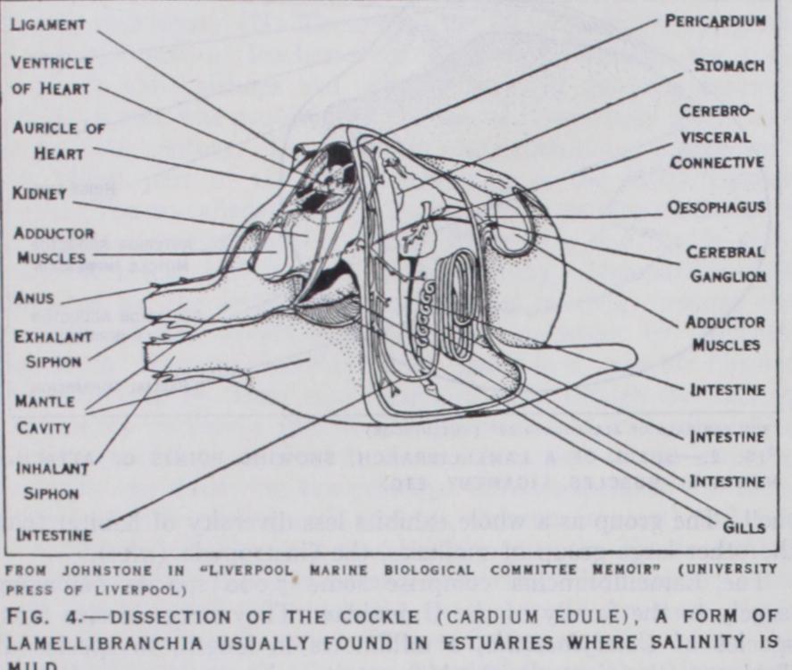 The Lamellibranchia comprise some 7,000 species belonging largely to the family of the Unionidae. They range in size from species of Condylocardia, a millimetre in length, to species of Tridacna (the giant clam) which attains a length of over 3ft., and Pinna. They have a considerable vertical range in the sea and are of almost universal distribution. Like the Gastropoda they first appear in the Lower Cambrian.