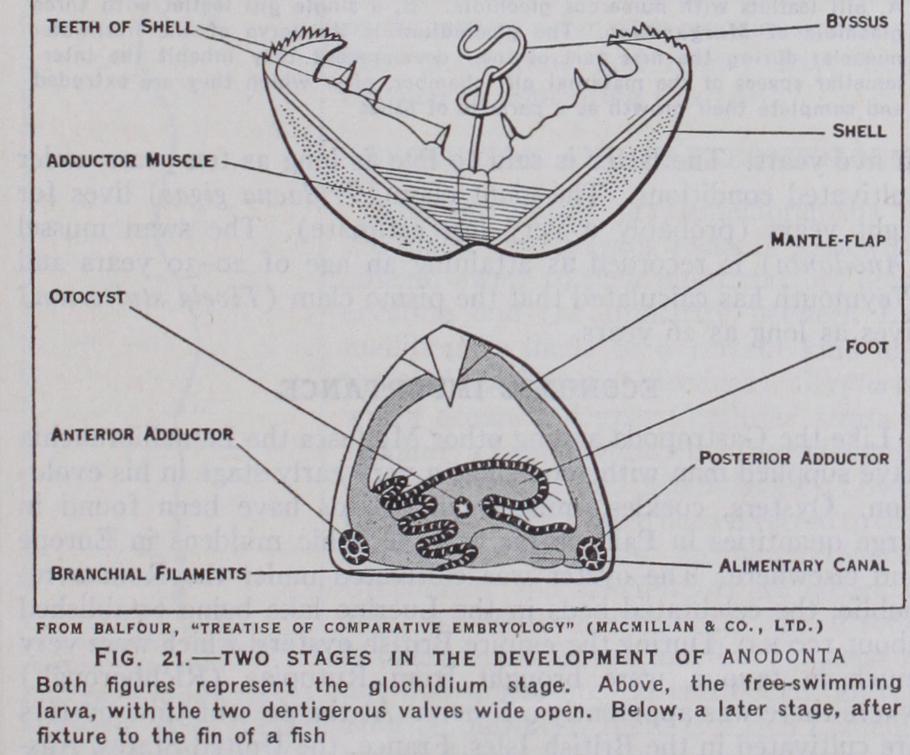 Freshwater Lamellibranchia have been found in all the great river systems of the world. The larger forms (Unio and Anodonta) tend to keep to rivers, lakes and large ponds; but the smaller forms (Pisidium, Cyrena, etc.) occur in pools, ditches, streams and marshes. As examples of regional localization we may cite the Etheriidae and Spatha which are exclusively found in Africa, where Corbicula is also well represented ; and Scapinda and Paral lepipedum which are peculiar to India. The dispersal of marine lamellibranchs is mainly effected in the free-swimming larval stage during which they drift about in currents. Such freshwater