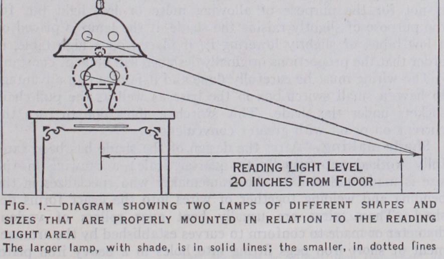 In order that lamp bases may harmonize with the furnishings of the home, they must be chosen from potteries, porcelains and bronzes of appropriate periods, conforming in colour and design with the rugs, wall hangings, furniture and general architectural treatment. Reading-light areas should be laid out in planning the arrangement of the lamp units in a room. When the radius of one of these reading-light areas has been established and the base selected for the lamp, the shade can be designed without regard to the light area and only when the mountings are planned should the light area be brought into consideration. The diagram in fig. I shows a table on which stands a large lamp with a shade of one shape in solid lines and a small lamp with a shade of another shape in dotted lines, and it will be seen that when a line is drawn from the circumference of the reading-light area this establishes the location of the electric bulbs on the mountings. The problem of lighting (q.v.) is considered sepa rately; this article is therefore concerned solely with the design and construction of a new type of art object which is to be moulded into the interior and made harmonious with it, giving it a proper accent in the form of a high-light when the lamp is in use, and casting over it a tint or wash that will establish the mood of the interior at night.