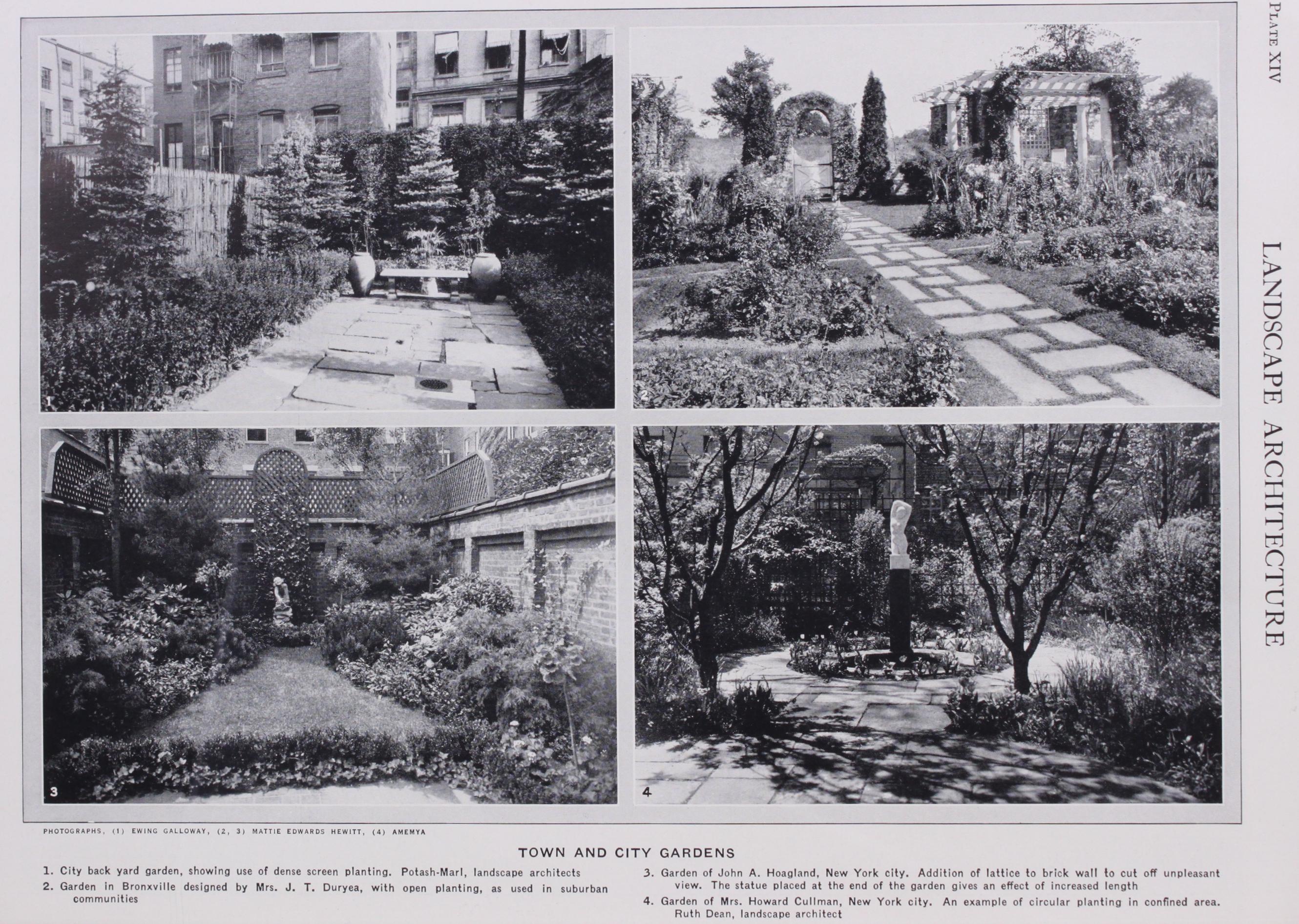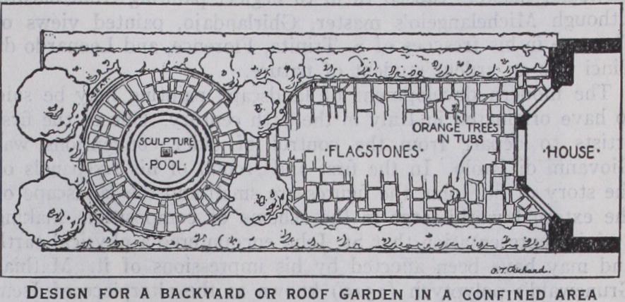 vegetation is so uncertain, the city garden is much more dependent on an architectural background and accessories than the suburban one where luxuriant foliage and flowers are possible. Under the best conditions the city garden cannot wholly mask or distract attention from the artificial elements by a wealth of blossoms. This means that walls, trellises, walks, fountains and seats must be so well designed as to create the atmosphere of a garden even though foliage is largely absent. A garden of this type in New York city is shown in the following plan, and although the size of the garden is only 20 by 4oft. it appears larger because the two Japanese flowering cherries in the foreground form an arch leading into the rear third of the 4oft. and by virtue of the picture frame so formed create an illusion of distance. These trees with a great deal of sunlight, well fertilized each year and frequently sprayed, thrive and blossom in a way that would be creditable in their native soil. To afford a place for children to play, the entire fore part of the garden is paved with flag, leaving on each side a border only r8in. wide for planting. Such a small space may seem a poor playground to country boys and girls, but most city children have only streets or distant parks. The figure ("Baigneuse," by Roy Sheldon) in this garden is its most prominent feature and illus trates the value of good ornament in scale. A commonplace piece of sculpture may nestle into a thicket of greenery and appear delightful in a country garden, but only the really distinguished appears worth while at close range and against an unflattering background.