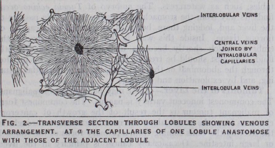 In mammals Sir William Flower pointed out that a generalized type of liver exists, from which that of any mammal may be derived by suppression or fusion of lobes. The accompanying diagram of Flower (fig. 4) represents an ideal mammalian liver. It will be seen that the umbilical fissure divides the organ into right and left halves, as in the lower vertebrates, but that the ventral part of each half is divided into a central and lateral lobe. The gall-bladder when present, is always situated on the caudal surface or in the substance of the right central lobe. The Spigelian and caudate lobes belong to the right half of the liver, the latter being usually a leaf-shaped lobe attached by its stalk to the Spigelian, and having its blade flattened between the right lateral lobe and the right kidney. The vena cava is always found to the right of the Spigelian lobe and dorsal to the stalk of the caudate. In tracing the lobulation of man's liver back to this generalized type, it is evident that his quadrate lobe does not correspond to any one generalized lobe, but is merely that part of the right central which lies between the gall bladder and the umbilical fissure. From a study of human variations compared with an Anthropoid liver, such as that of the gorilla, it is fairly clear that the human liver is formed, not by a suppression of any of the lobes of the generalized type, but by a fusion of those lobes and obliteration of certain fissures. This fusion is attributed by Sir A. Keith to the effect of pressure following the assumption of the erect position. The accompany ing diagram (fig. 5) shows an abnormal human liver in the anatomical department of St. Thomas's hospital which repro duces the generalized type.