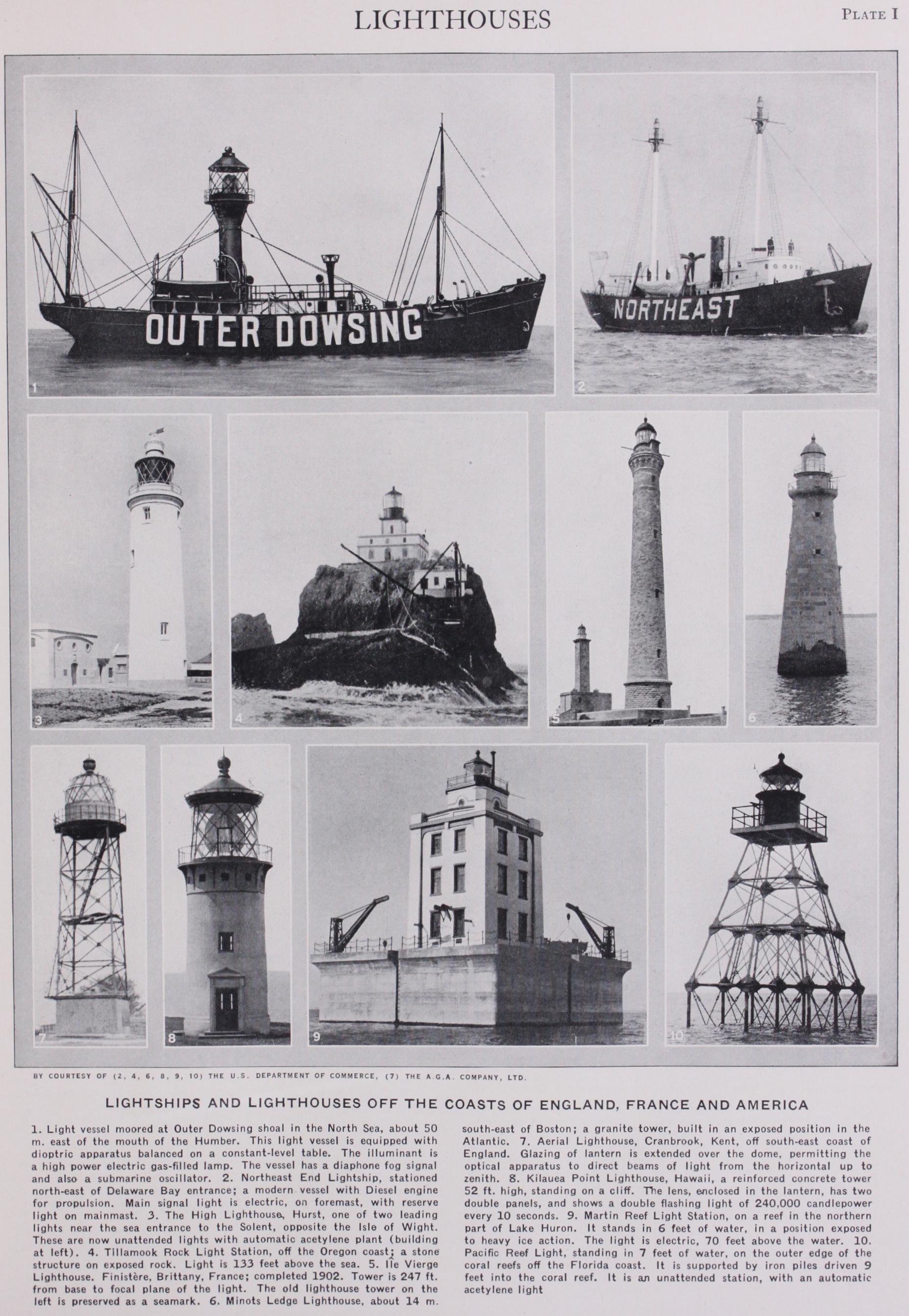 Fastnet.—The first lighthouse on the Fastnet rock, off the south-west coast of Ireland, was a circular cast-iron tower 86 ft. in height completed in 1854. It was erected on the summit of the rock which in 1895 was found to be considerably undermined. In 1899 a granite structure of increased height and founded upon a sound ledge of rock on one side of the higher, but undermined, portion of the reef, with its foundation laid near high water, was commenced and completed in 1904 (Plate II.). The focal plane is at a level of 158 ft. above high-water mark.