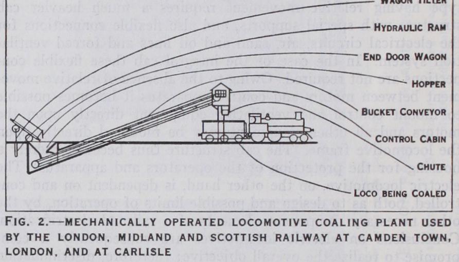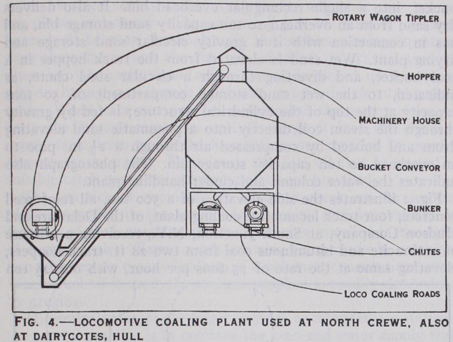 In fig. 4 is shown a diagram matic representation of the type of locomotive coaling installation employed at North Crewe and at Dairycotes, Hull. In this a bucket conveyor is used for rais ing coal to the bunker. The manufacturers of this are Messrs. Spencer (Melksham) Ltd., Melksham, Wilts.