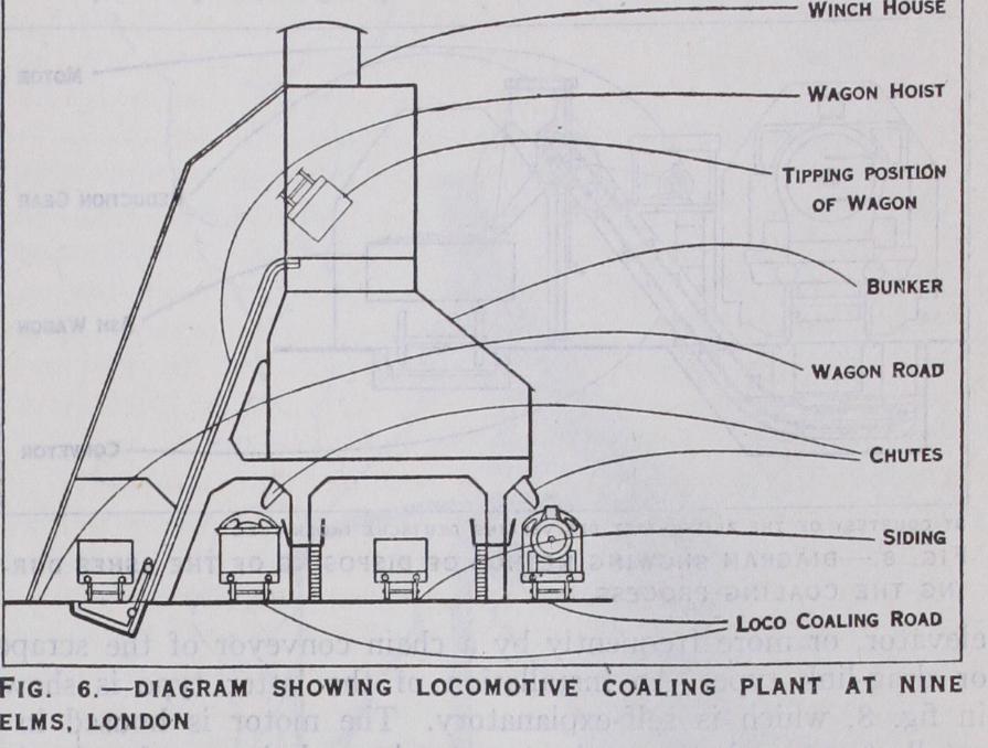 All the latest coaling plant in Great Britain is of the type in which a modification of side discharging wagon tipplers are em ployed (see fig. 5), which represents the plant at South Crewe, where the wagons are lifted vertically, while fig. 6 is a diagram matic representation of the Nine Elms plant, in which the path of the rising wagons is steeply inclined. These installations were both built by The Mitchell Conveyor & Transporter Co. Ltd.