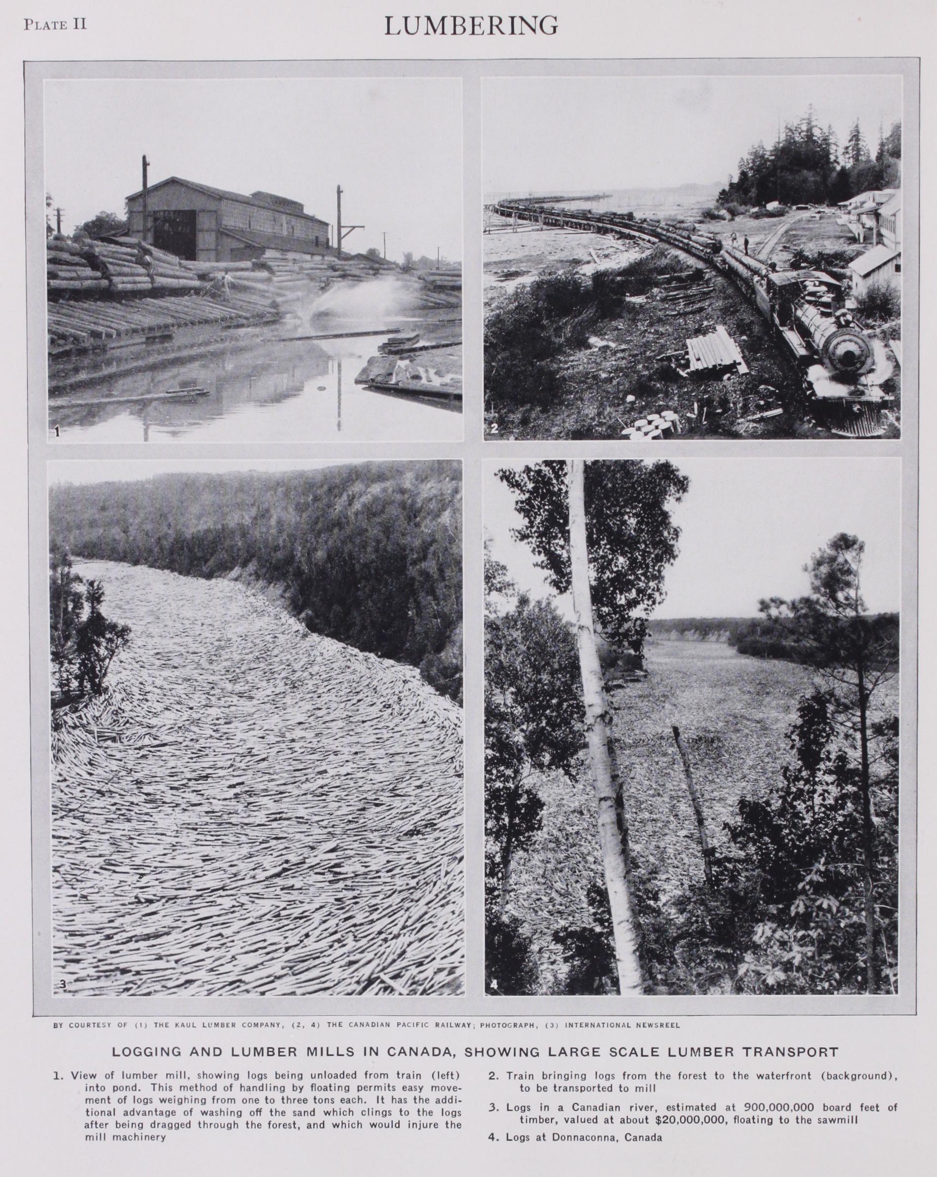 The methods of felling trees and converting them into logs are generally the same. First, the standing tree is undercut with an axe on the side of fall. A cross-cut saw, handled by two men—one at each end—is employed opposite the undercut. Where the ground is flat, the men cut from the ground but where the ground is rough or sloping and irregular, and particularly on the west coast, the undercutting and sawing is done from a platform or spring-board. After felling, branches are trimmed off and the tree is sawed or "bucked" into log lengths, usually 16 ft. except in the North west, where much longer lengths are handled (24 to 4o ft. are common and in the most modern operations 49 to 65 ft. are the most favoured units of length). Certain other districts also cut logs to lengths greater than 16 ft. After bucking, the logs are dragged or "skidded" to concen tration points by horses, oxen or power, but as previously ex plained, steam or electric power has supplanted, in many instances, the horses and oxen. Where steel cables are employed over valleys and canyons, the method is called "high-lead" skidding. Other methods are known as overhead skidding—where the logs are hoisted up over the brush and ground for some dis tance, and ground-line skidding which is the dragging of the log over the ground by means of a cable. In the North-west a "spar" tree frequently is employed in the skidding operations. This tree is selected for its height and favourable location with regard to the surrounding trees to be felled. A man known as a "high-climber," ascends the tree, aided by climbing spurs affixed to his shoes and a rope around the tree. He is equipped with a saw and axe and as he ascends he cuts off interfering branches until he reaches the desired height which usually is about 175 to zoo ft., and some 3o to 5o ft. from the tree top. Then he saws off the top, waits until the swaying caused by the top's rebound has stopped, and descends. Another man, known as a "rigger," next ascends, carrying equipment for rigging. Finally the spar is rigged at the top with cable and pulleys and a loading boom is affixed some 20 ft. above the ground. A cable with grab hooks on the end is carried to the log to be skidded and then, by means of a steam or electric skidder the log is dragged within distance of the loading boom which raises the log off the ground and loads it direct onto a nearby car or stacks it for future loading. When the logs reach the mill centres, they are stored in log ponds which usually cover a number of acres. Here they are kept until ready for manufacture. The ponds facilitate assorting and cleaning, and also prevent deterioration which would occur if the logs were left dry for any appreciable length of time.