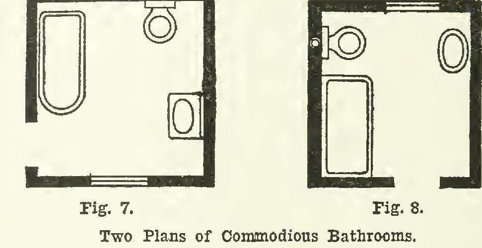 ered. This, however, is not a satisfactory way of doing, since the bathroom should be as con venient in arrangement as any other room. In the bathroom the usual necessary fixtures are a bathtub, a lavatory or wash-bowl, and a water closet. In more expensive homes a foot-bath and a sitz bath are provided; sometimes a shower bath also. There should be ample room for the placing of these fixtures, with plenty of room around them. In Fig. 6 is shown the smallest room that can accommodate the neces sary fixtures. While this will serve in the cheapest houses, yet the arrangements shown in Figs. 7 and 8 are much better.