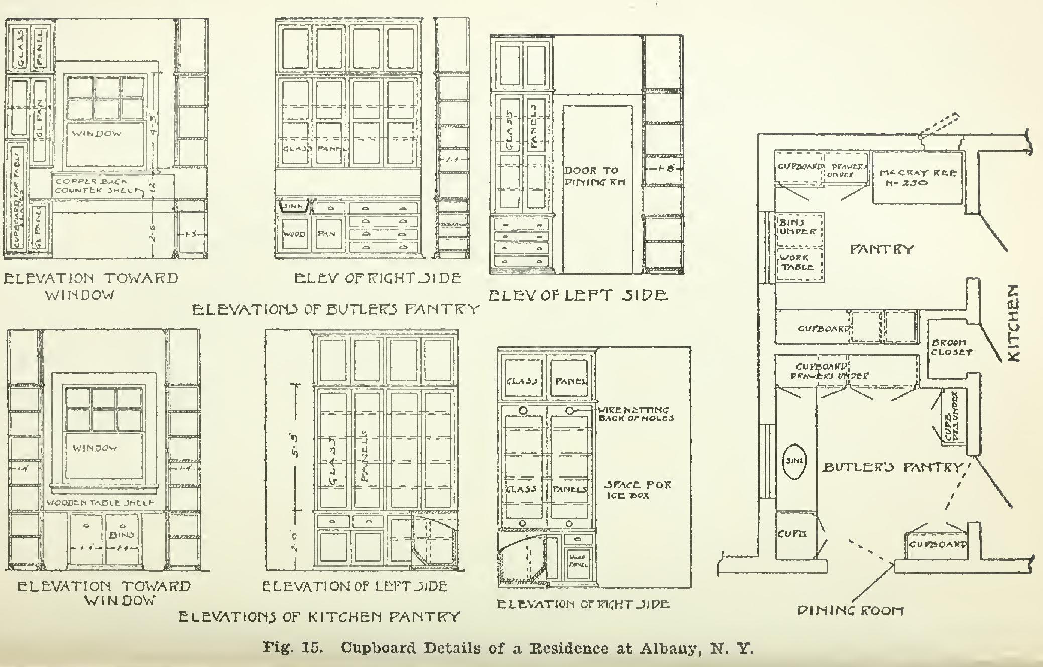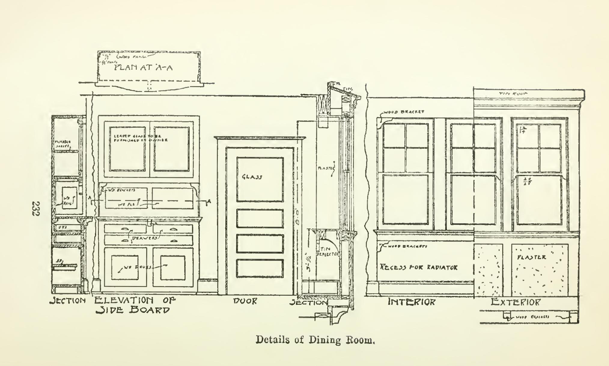 To indicate further the general treatment of the interior finish, the rooms having anything in the way of a paneled wainscot, beamed ceiling, or finish around a fireplace, also the sideboard, cupboards, and pantry fittings, should all be shown. The best and perhaps the most com mon method is to draw at one-quarter-inch scale the different elevations of the rooms, showing exactly the height, width, and any features of unusual arrangement. Should opposite sides of a room or any sides be similar, after putting the title on one drawing, note under it: "Oppo site, north, south, etc., sides similar." There is usually one sheet of just such drawings as this to accompany the regular set of drawings. Since plans are usually submitted to competitive contractors, there is not the chance of one pro posal or bid being lower than another because certain things were overlooked or purposely omitted.