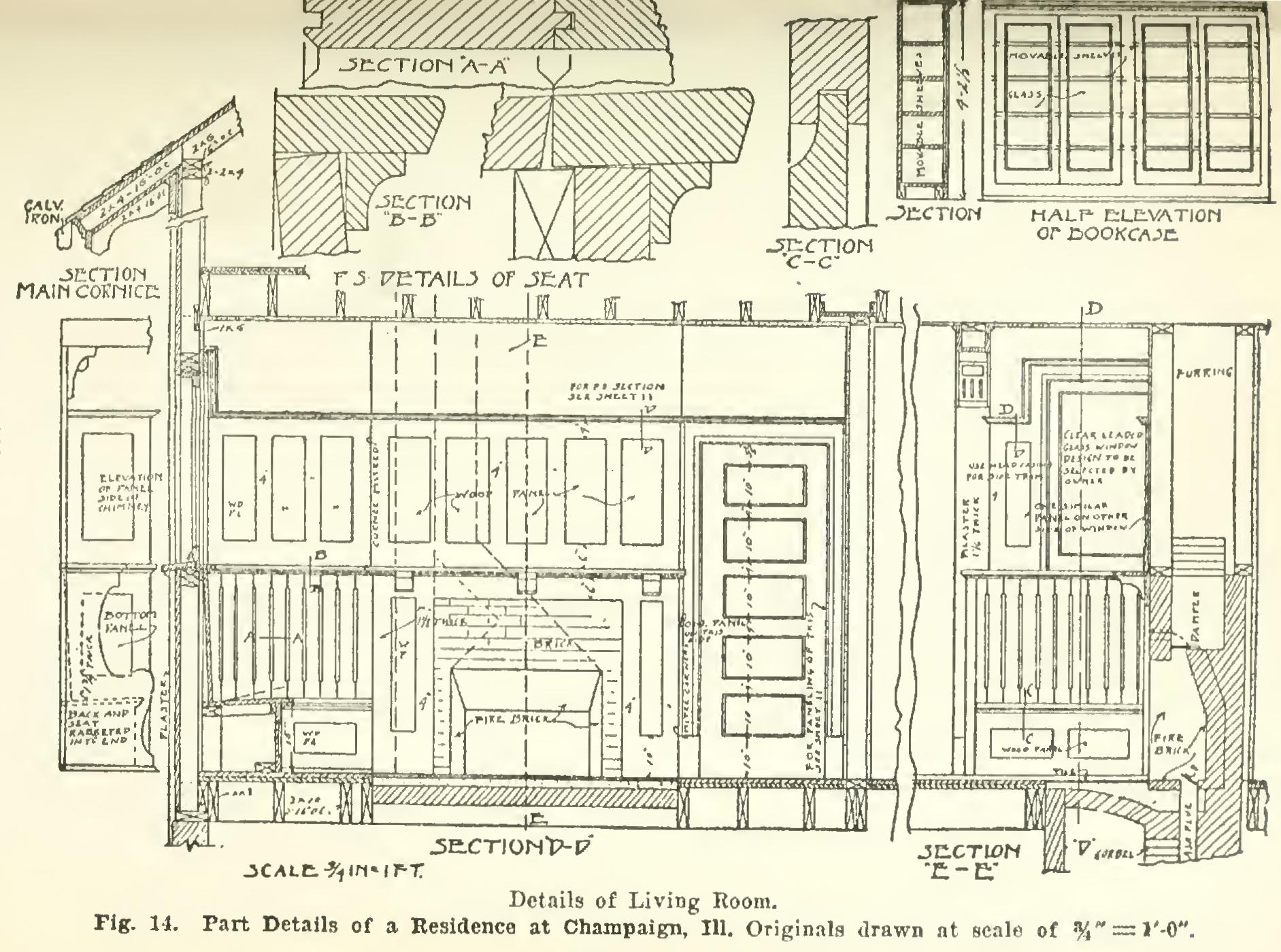 Be very careful to note on the plans just where each section is taken, and put correspond ing letters on the title for the section. The use of notes and plenty of them cannot be urged too strongly. The small working drawings are very unreliable as to details; and consequently the more details, the better the contractor will un derstand just exactly what he is to furnish, and will therefore be able to figure the more closely. These details, well executed, will prevent many disputes between contractor and architect, and between architect and owner, as well as save the bills from the contractor which are sure to arise from incomplete drawings.