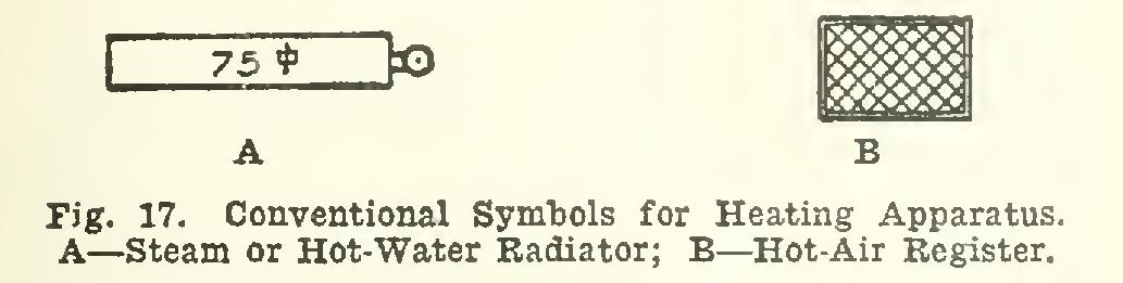 For lighting, there are standard symbols adopted by the National Electrical Contractors' Association of the United States. These are published on a card convenient for reference, and copies may be had by applying to the Secretary. Another form of symbols has been adopted by the Boston Society of Architects, copies of which may also be had on application. The latter sym bols are shown on Plate C. These are given for convenience in laying out plans, and are not intended to be complete in every respect. It is essential to show the location of the light outlets in all rooms; also whether they are to be gas, or electric, or a combination of both. Push buttons, bells, and telephones are also indicated. If these locations are not shown, the contractor for this work will naturally place them in a posi• tion requiring the least amount of pipe, wire, etc. Therefore show all of these fixtures, and there can then be no dispute as to the true intent of the plans and specifications. • For the heating, about all that is necessary is to show the location of the registers or radiators, marking the number of square feet of radiation on each radiator. The usual method is shown in Fig. 17 (A) for steam or hot water, and in Fig. 17 (B) for hot air. The specifications should describe the kind of heat, and go into detail about pipe, fittings, etc.