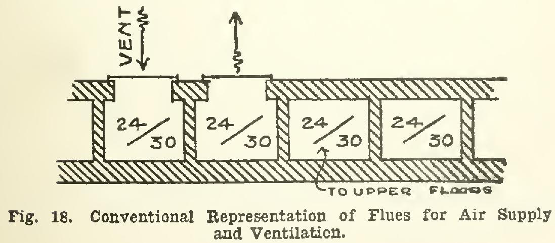 The method of figuring the correct location for such work will be considered under "Heating and Ventilating." The conventional method of showing flues for air supply and ventilation is shown in Fig. 18.