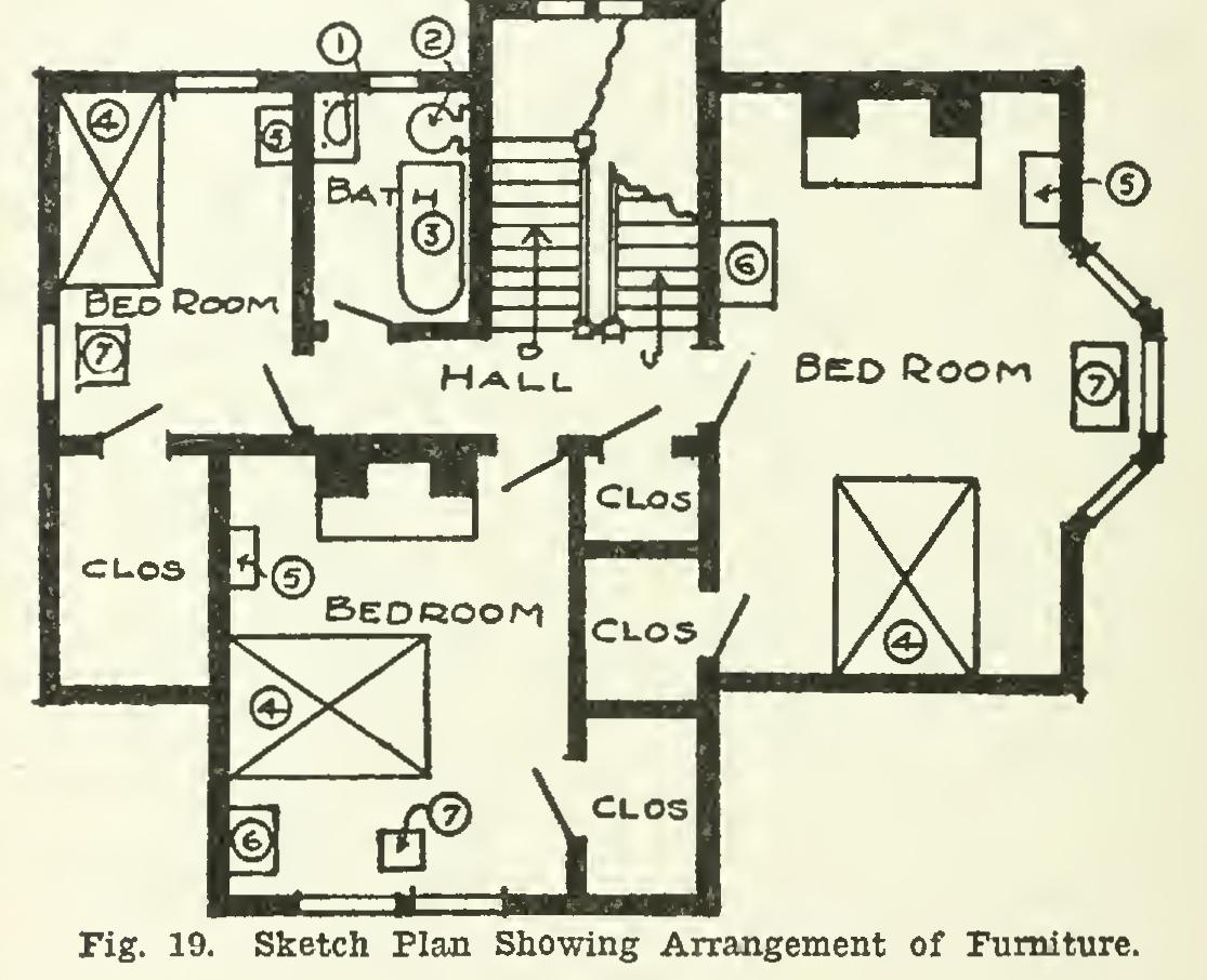 For furniture, certain conventional forms are used, and shown on all plans. The furniture of the bedrooms and bathrooms is usually laid out on the plans, since these are usually made as small as practicable; therefore the furniture and fittings are laid out to make sure that there will be room to get them all iu. This applies to the cheaper classes of houses, for in the larger and more expensive residences the rooms are always amply large to accommodate all the fur niture and fittings desirable. In Fig. 19, a bath room and bedrooms are laid out, the furniture being indicated by munbers, (1) representing the lavatory or wash-bowl, (2) the closet, (3) the bathtub, (4) the bed, (5) the chiffonier, (6) the dresser, and (7) a table or writing desk. See also Fig. 20.