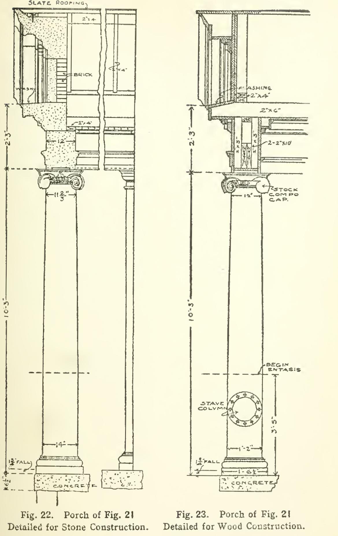 Fig. 21 shows the elevation of a porch, and Fig. 22 shows this porch detailed for stone con struction; while Fig. 23 shows the same porch detailed for wood.