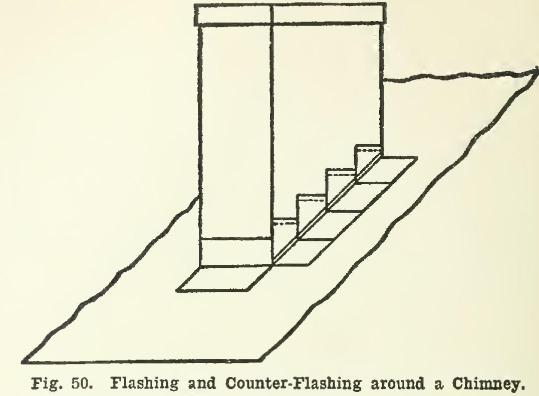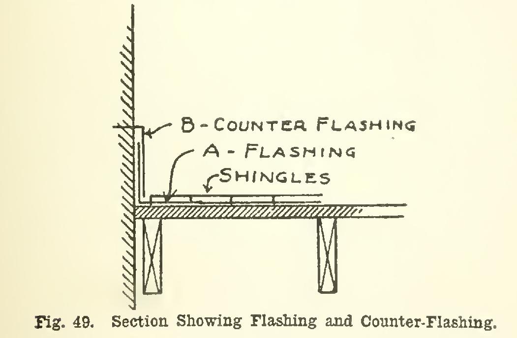 To prevent the water running down the side of the chimney, a cover-piece, called the counter flashing, is fastened into a mortar joint of the brickwork, and turned down over the flashing. The counter-flashing should extend to within two inches of the bottom of the flashing. This same method of protection applies to joining a roof to a vertical wall, the protection at the outside of a window-frame, or any other place needing similar protection.