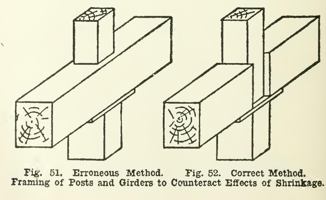 Shrinkage. A word might be said about shrinkage. All lumber, when exposed to heat, will shrink, owing to the moisture drying out. In all wooden construction, all parts should be carefully framed together to reduce the shrink age to a minimum. One common error in framing is shown in Fig. 51. The girder rests upon the post below, and the post from above rests upon the girder. We can see at a glance what happens when the girder commences to dry out. It will shrink, causing the post above to settle, which will affect the part of the build ing carried in this way. Fig. 52 shows a much better way of framing these posts. The post above rests directly on the post below; and the girder is carried by the steel plate as shown, or by means of a cast-iron post-cap. By this means the shrinkage in the girder does not affect the construction above. Carry out this same idea in all framing. When one partition comes over another, carry it on the cap of the partition below, and not on top of the floor construction.