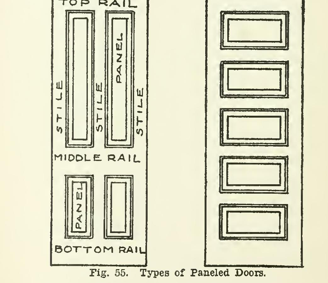 Fig. 54 shows a typical section of a built-up door; and Fig. 55 shows elevations of different doors, with the names of the various parts of a door.