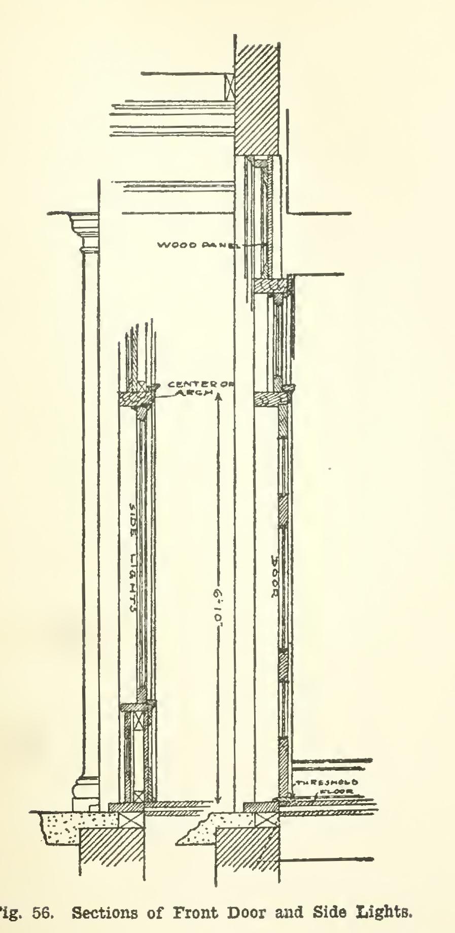 At the bottom of the door we have the threshold, which is a raised piece, usually of oak or some other hard wood. This gives a chance for the door to swing clear of the carpet or rugs. For different details of door trim, etc., see Fig. 56.