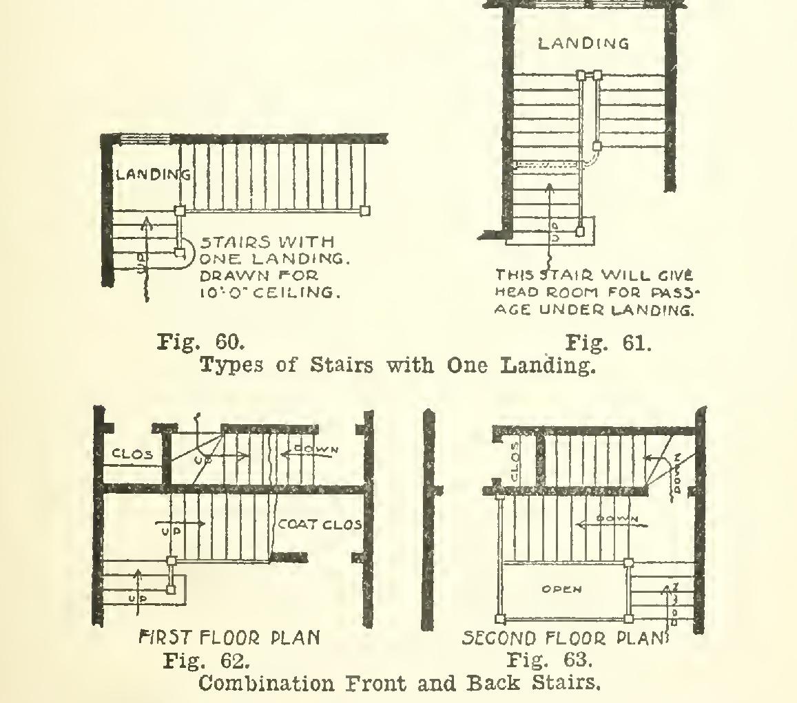 Fig. 60 shows a stairway with a landing. Fig. 61 is another form of stair with a landing. Fig. 62 is a combination front and back stairs. There are separate stairs up to the land ing; then the back stair joins the main stair. Fig. 62 is the first-floor plan, and Fig. 63 the second-floor plan, of the same stairs.