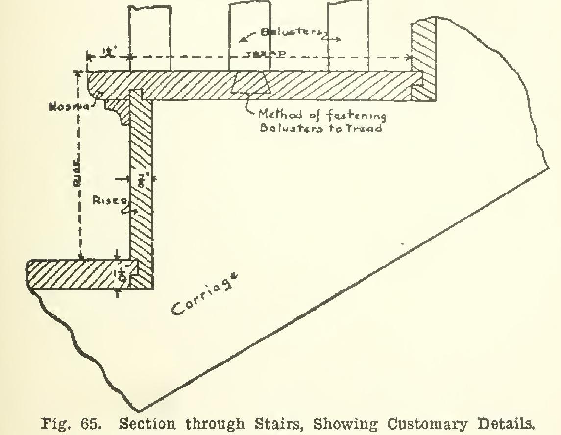 In Fig. 65 are shown the customary details. The riser is known as the vertical portion, and the tread as the horizontal portion. The main supports are usually 2 by 10-inch or 2 by notched to fit the treads and risers, and are called carriages. The balusters are the upright spindles or ornamental pieces supporting the hand-rail.