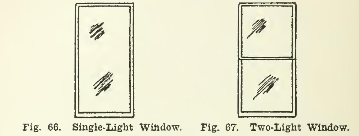 Windows. There are various types of win dows used in the construction of buildings. The plainest is the single-light window shown in Fig. 66. This is either pivoted, hinged, or fixed to slide.