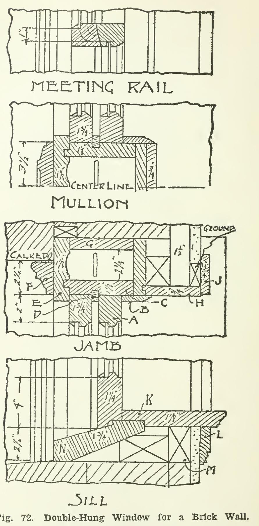 In Fig. 71 we have the details and dimen sions for a double-hung window in a frame wall, the exterior of the wall being plastered. In Fig. 72 we have the details for a double-hung win dow in a brick wall. Notice that there is very little difference in construction. The parts of the construction are named for the sake of clearness, A being the sash, B the inside stop, C the pulley stile, D the parting strip, E the outside casing, F the brick mould or staff-head, G the back lining, H the sub-jamb, J the inside casing, K the stool, L the apron, M the ground, and N the sill.