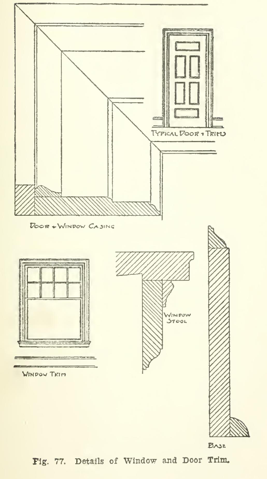 Fig. 76 shows the details of a casement win dow in which the head, mullion, and sill, with all adjoining construction, are shown. Notice the grounds or guide for the plaster work, as spoken of under "Lath and Plaster." Fig. 77 shows the interior elevation of the door and window trim, with a large-scale draw ing of the exact profiles of this trim. The trim, and in fact all interior woodwork, are fastened to the grounds, which are set to serve as guides for the plasterer, and which should be placed back of all interior finish. The base shown is the finish at the floor-line. The base is nailed to grounds; and the quarter-round mould at the floor is nailed to the floor, to cover the crack at the joining of the base and floor-line.