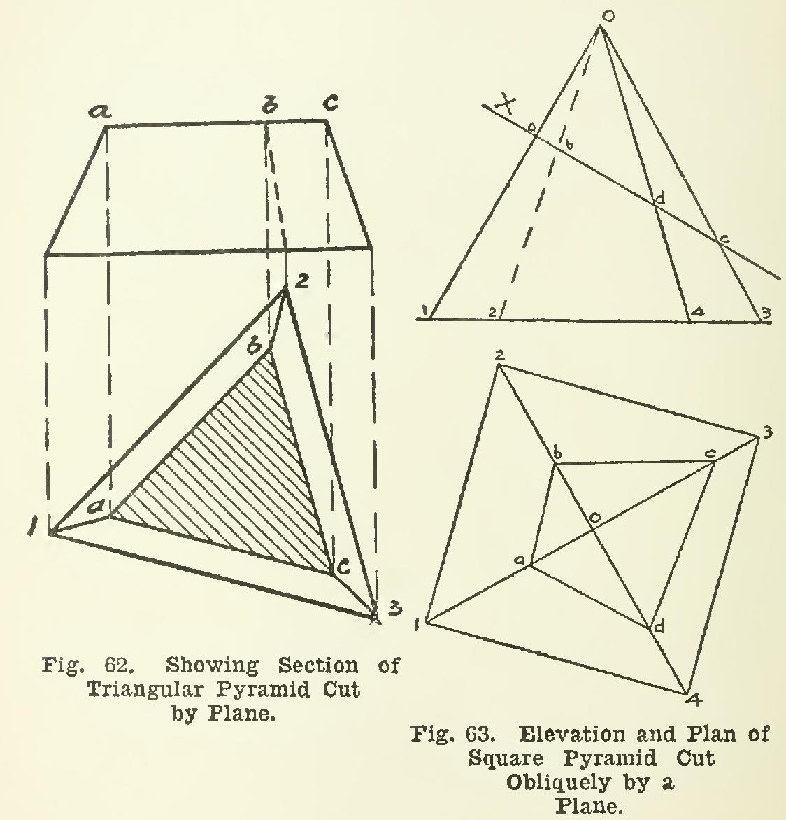 80. Fig. 62 shows the same pyramid with the part above plane X removed, showing in plan the actual surface cut by the plane.