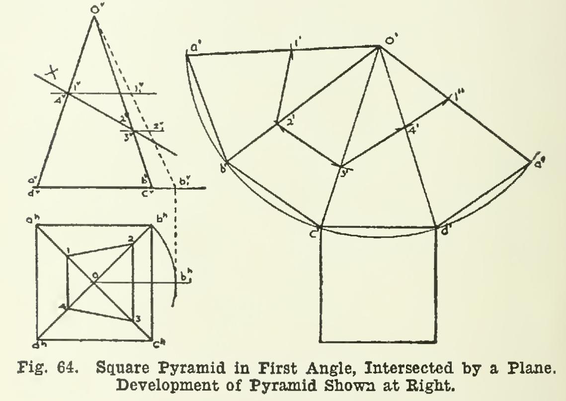 82. Fig. 64 shows a square pyramid in the first angle, intersected in a similar way by a plane X; it shows also the development of the pyramid.