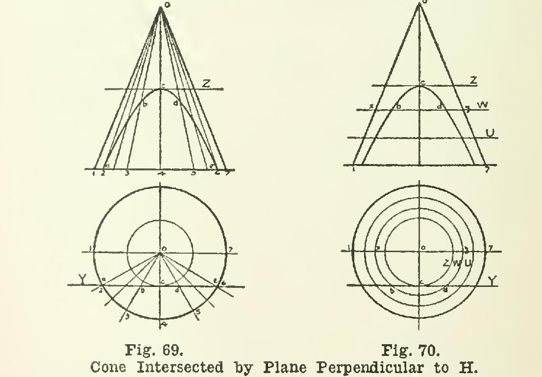 86. In Fig. 68 is shown a right circular cone standing on its base, and intersected by a plane X, which is at right angles with V. The base may be divided into any number of parts—in this case twelve—and the elements of the cone drawn, as 0-1, 0-2, 0-3, etc. These elements are cut by the plane in points showing in elevation as a, b, c, etc., and these points are then pro jected to corresponding elements in plan.