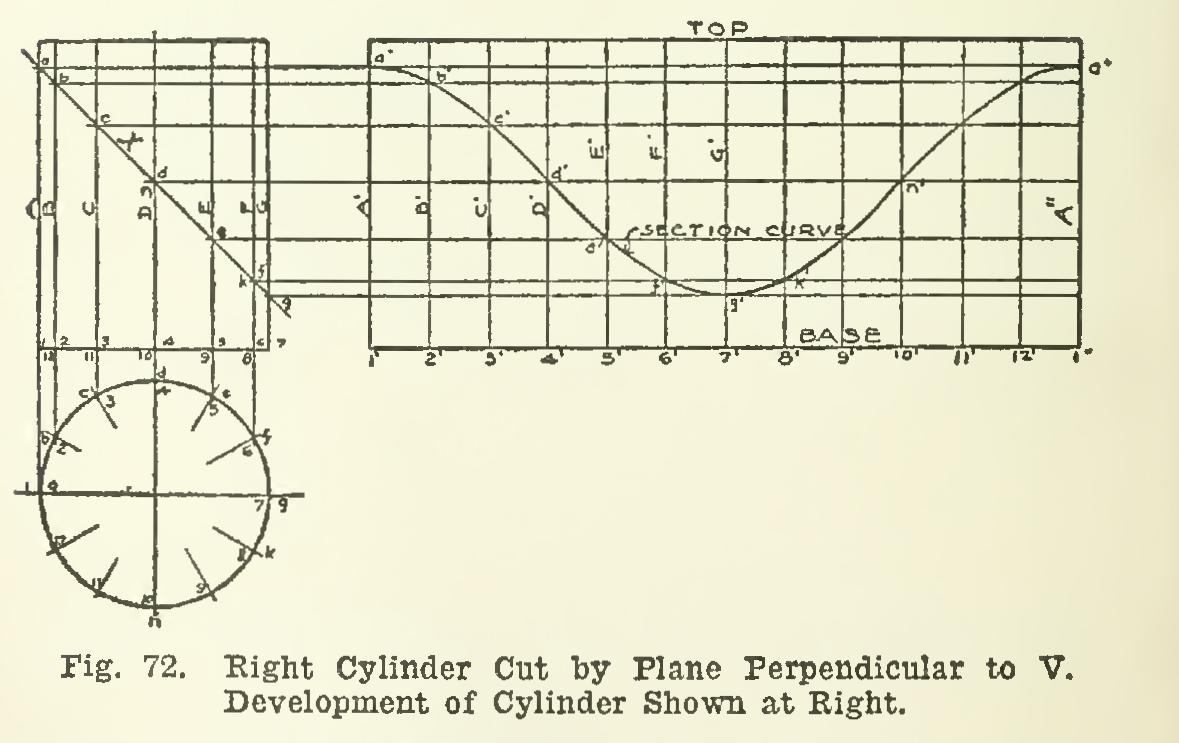 Intersection of a Plane with a Cylinder 91. A right circular cylinder standing on its base and cut by a plane X perpendicular to V, is drawn in Fig. 72. The development of the cylinder is also shown. As in the ease of the plane cutting the cone, elements of the cylinder are drawn, and the points noted in which the plane cuts the elements. The base is here divided into twelve equal parts, and twelve ele ments drawn. The plan of the intersection will coincide with the plan of the cylinder, since the whole convex surface is projected in the circle.