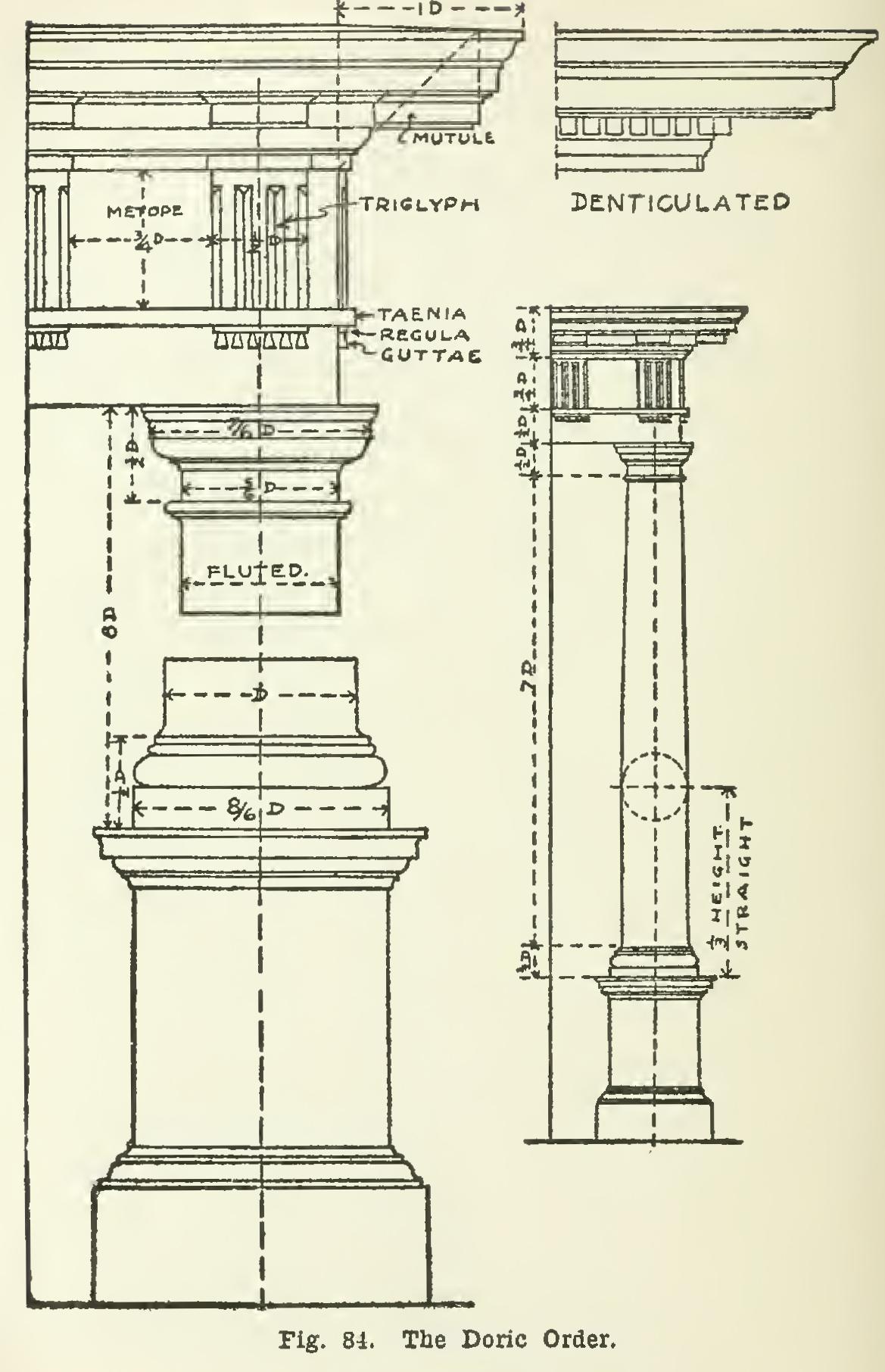 There are two types of cornices used with the Doric Order—one with the mutules (project ing flat blocks ornamented on the under sur face); and the other with the dentils (a course of small cubes in the bed-moulding). The general profile of the cornice is different in the two types. The shaft is very often fluted.