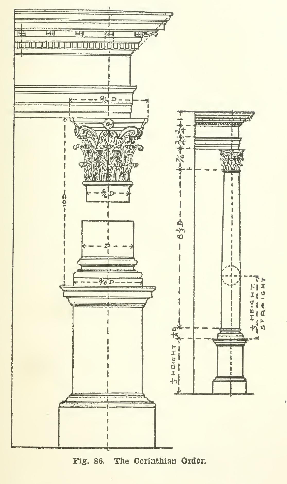 Fig. 86 shows the Corinthian Order. The main difference from the other Orders is the capital, which is highly ornamented by means of acanthus leaves. This Order is probably the most dignified, and is also the most expensive. Sometimes the shaft is fluted. The mouldings are all greatly ornamented.