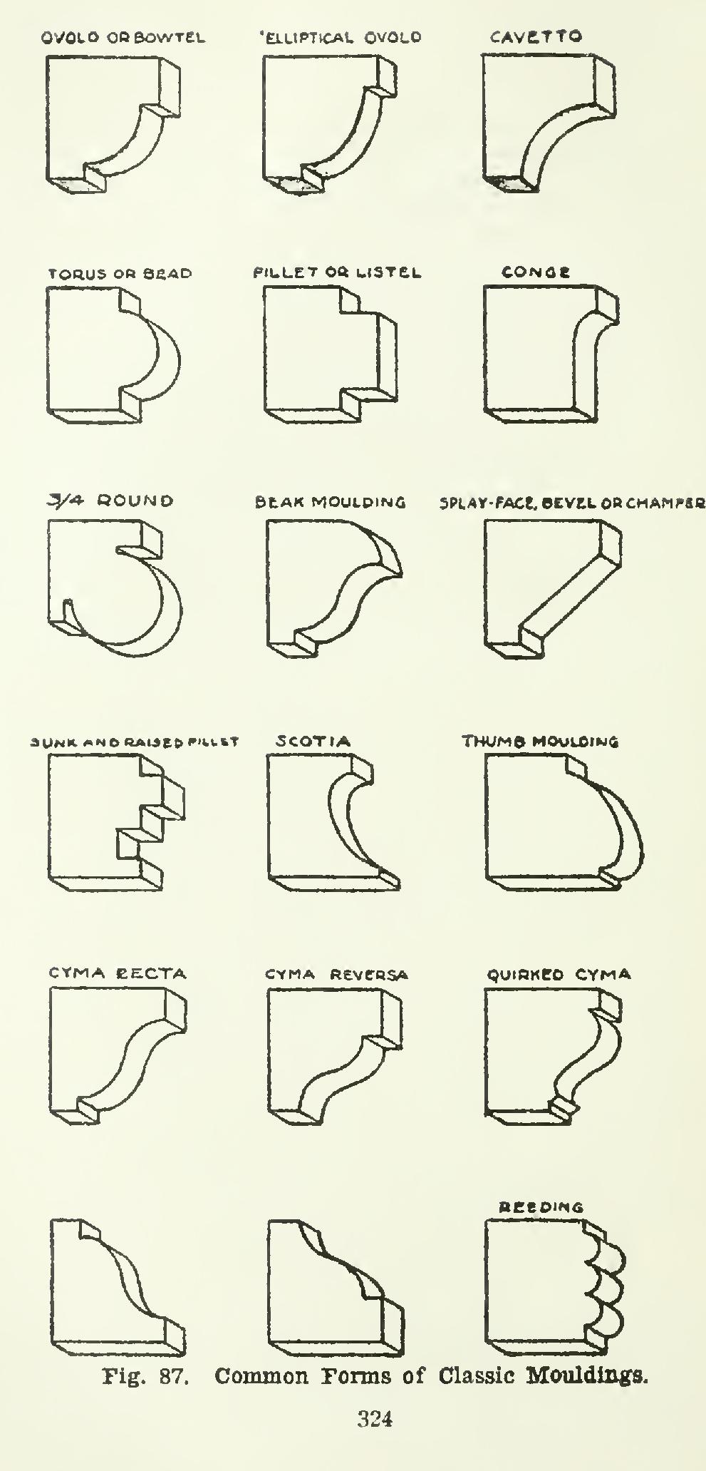 Fig. 87 gives some of the common forms of mouldings, with the corresponding names.
