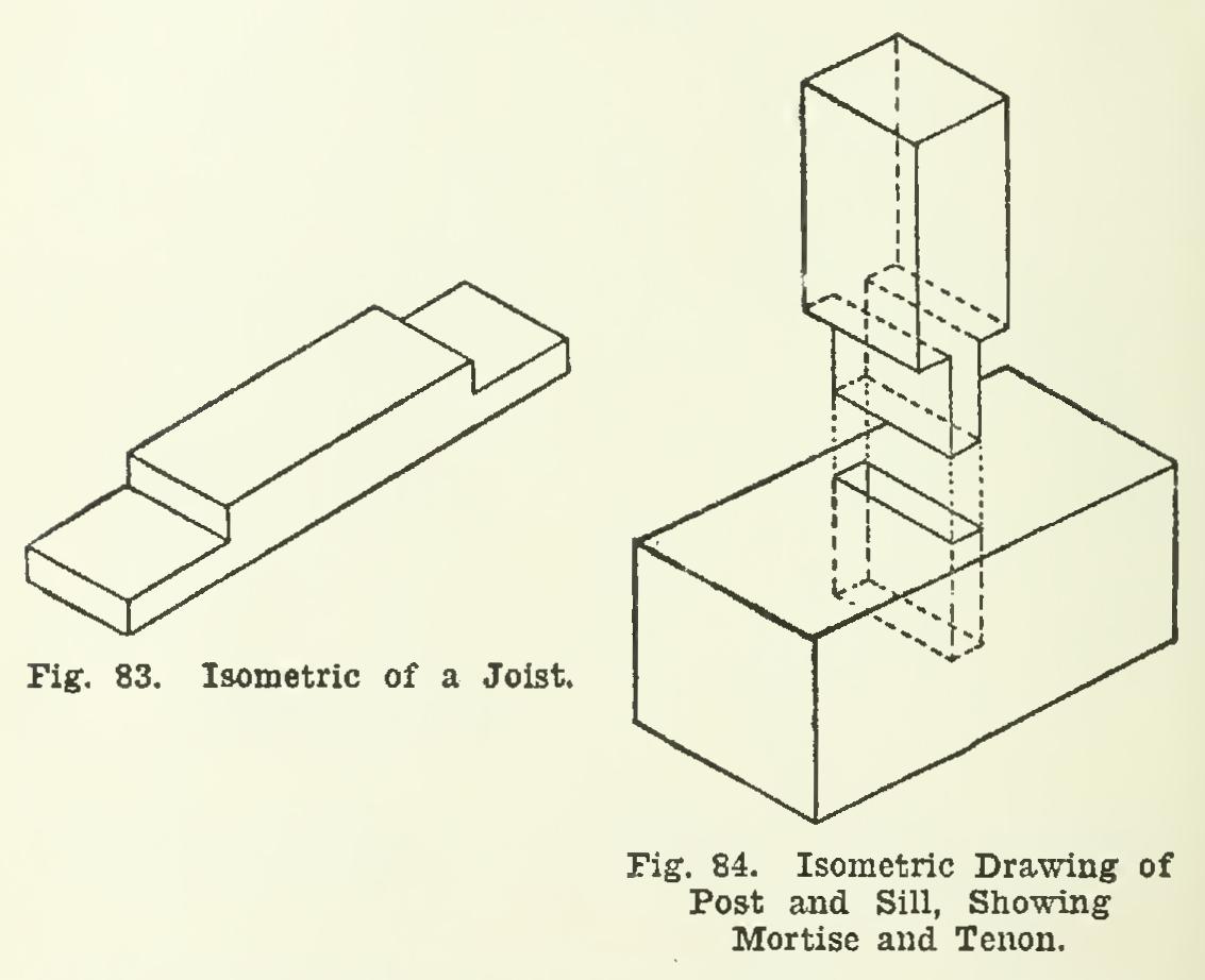 115. The isometric of a post and sill, show ing a mortise and tenon, is drawn in Fig. 84.