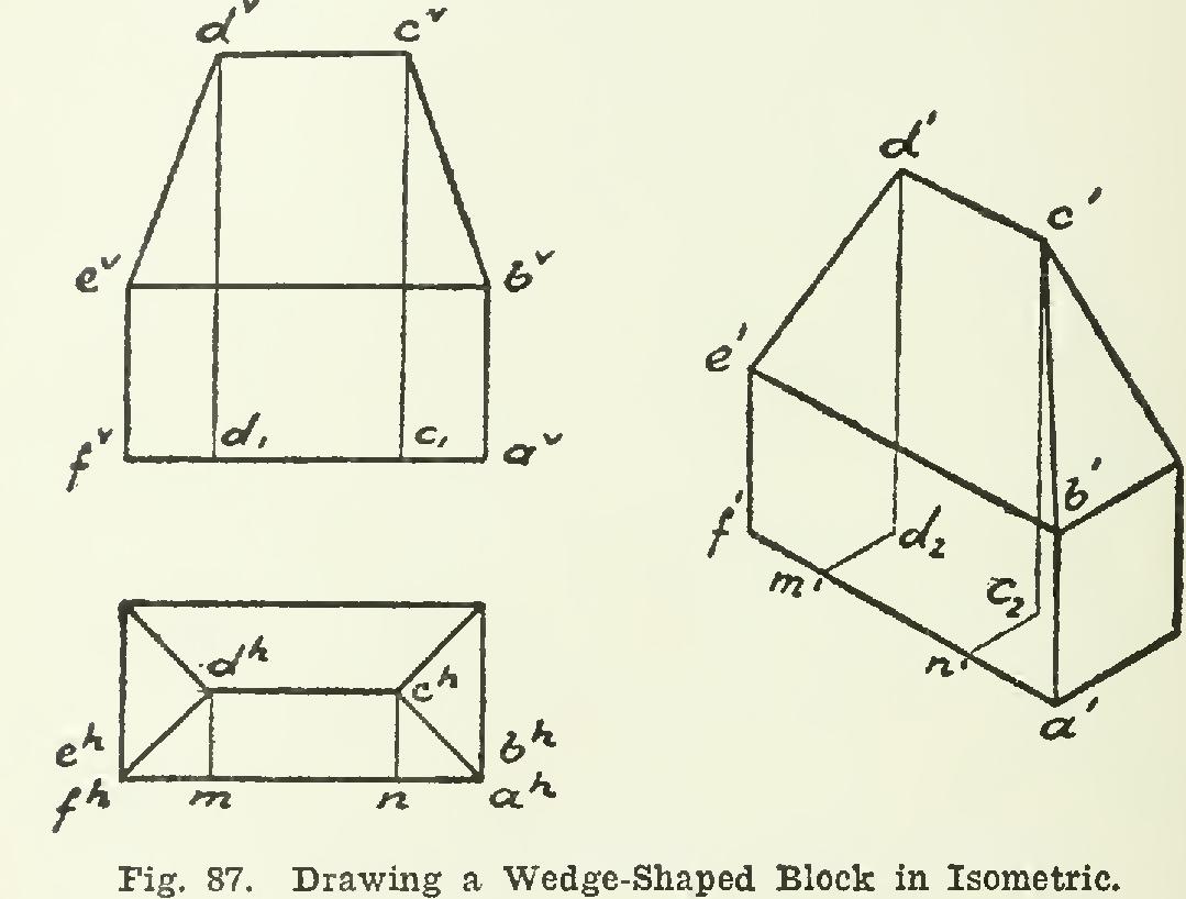 120. To draw a wedge-shaped block in iso metric, refer to Fig. 87. The base is drawn in isometric as before, and the vertical edges may be &awn immediately, obtaining points etc. The point is located in isometric by means of three co-ordinates or distances, taken from the projection. First, the horizontal dis tance ah-n, laid off at second, another hori zontal distance ch-n drawn at and third, the vertical height laid off at The point cl is thus fixed in position by the three co-ordinates parallel to the isometric axes. The