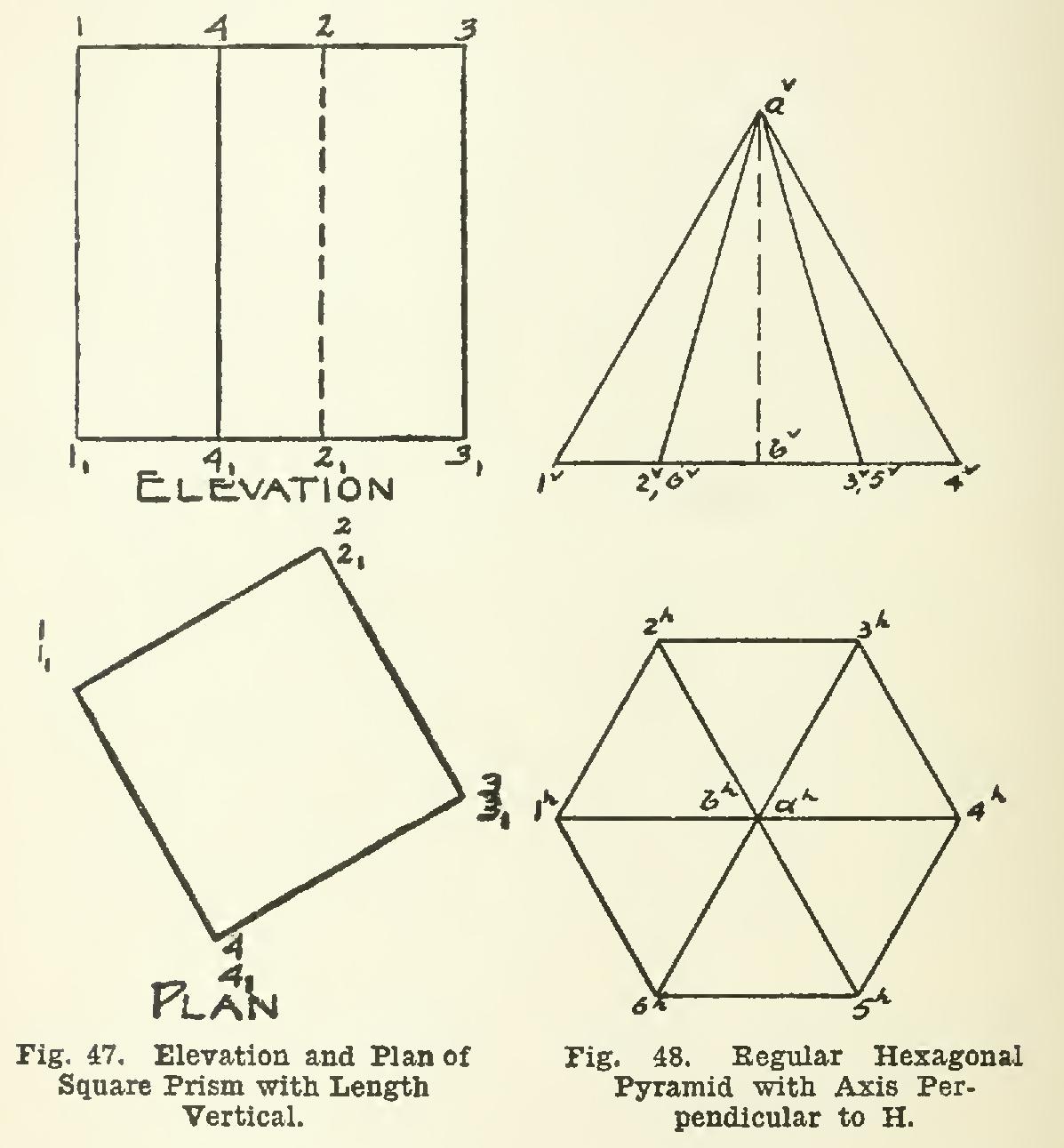 These principles are still'further illustrated. in Figs. 47, 48, and 49. Fig. 47 shows a square prism placed with its length vertical. Notice the numbering of the top and bottom. Why are some of the faces in elevation shown in their true size? Only one dotted edge appears. (A dotted edge in any projection is understood to mean an edge which is not visible in that view.) 56. In Fig. 48, a regular hexagonal pyramid is given standing on its base, and with its axis ab perpendicular to H. This solid has six sloping surfaces and one base. Of these seven faces, the base alone appears in its true size.