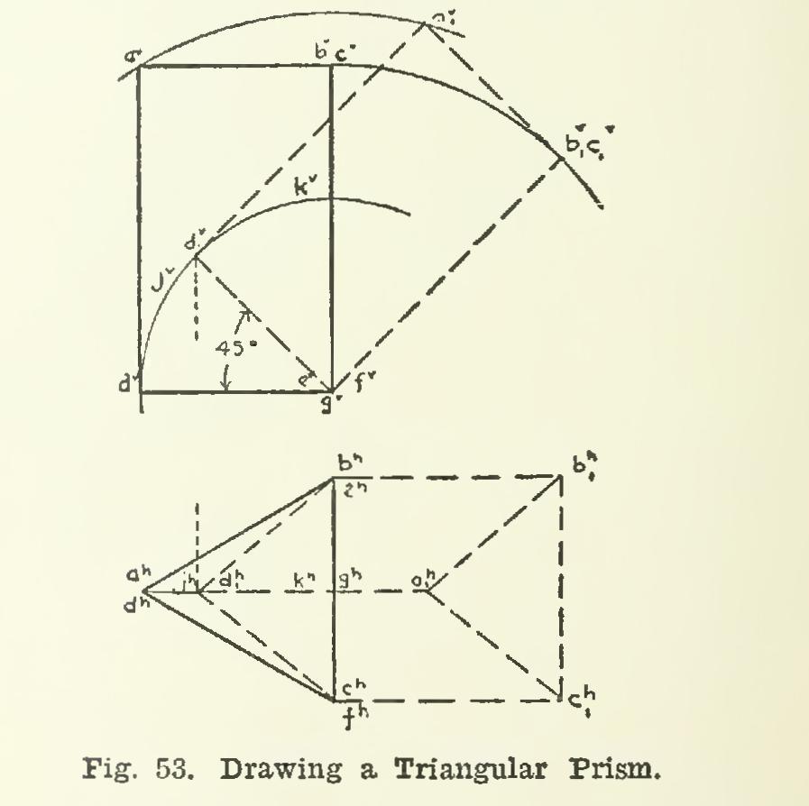 63. Suppose that it is required to draw a tri angular prism standing on one end, and with one edge of the base at right angles with the V plane, Fig. 53. According to the preceding directions, the base is drawn first, placed in a horizontal position, and with the right-hand side perpendicular to V. The elevation may then be drawn as before explained.