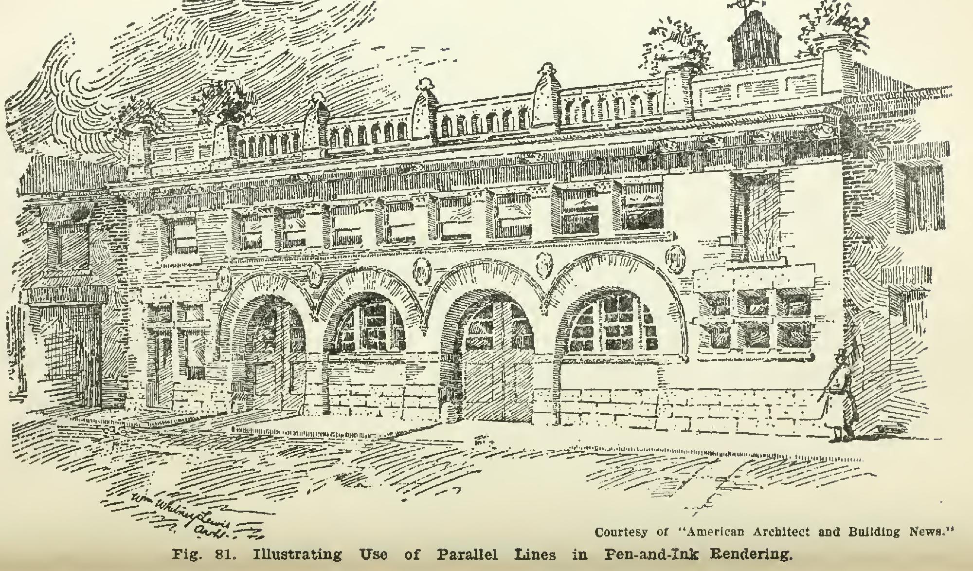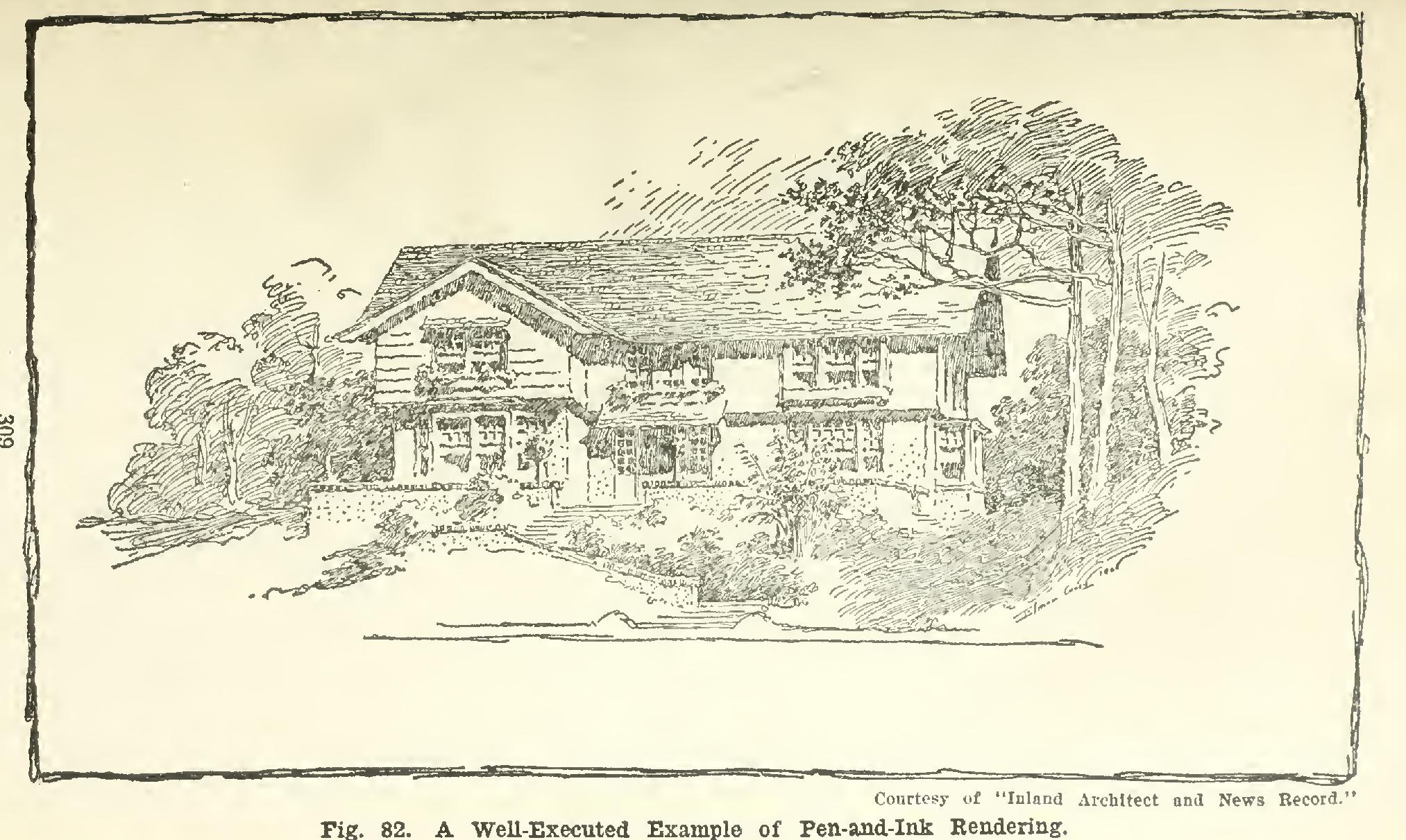 Referring to Fig. 80, we see in this draw ing, the general method of rendering a building in pen and ink. The window-panes, instead of being hard, sharp lines, are made by a series of parallel lines representing the shadow. Notice the treatment of the roof, the shadow of the cornice, and the general lines of the building.