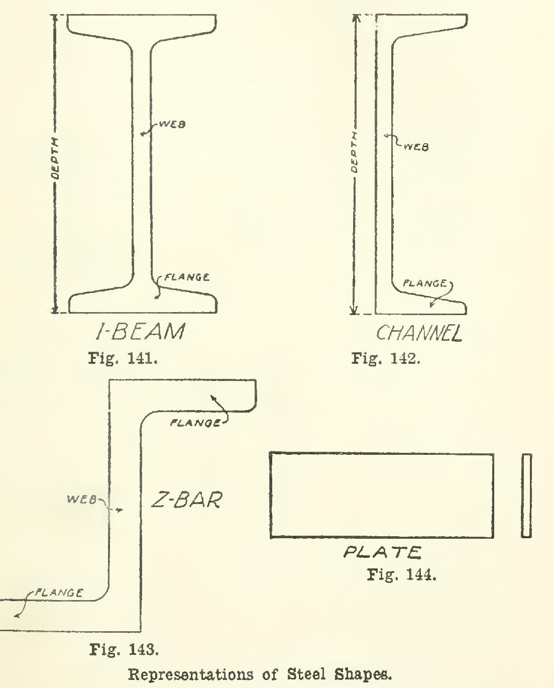 Angles (Fig. 140), channels (Fig. 142), (Fig. 143), and plates (Fig. 144), are the elementary parts most used in the construc tion of built-up girders and columns. The I-beam is commonly used as a beam or girder, while the uprights or columns are usually of the built-up variety.