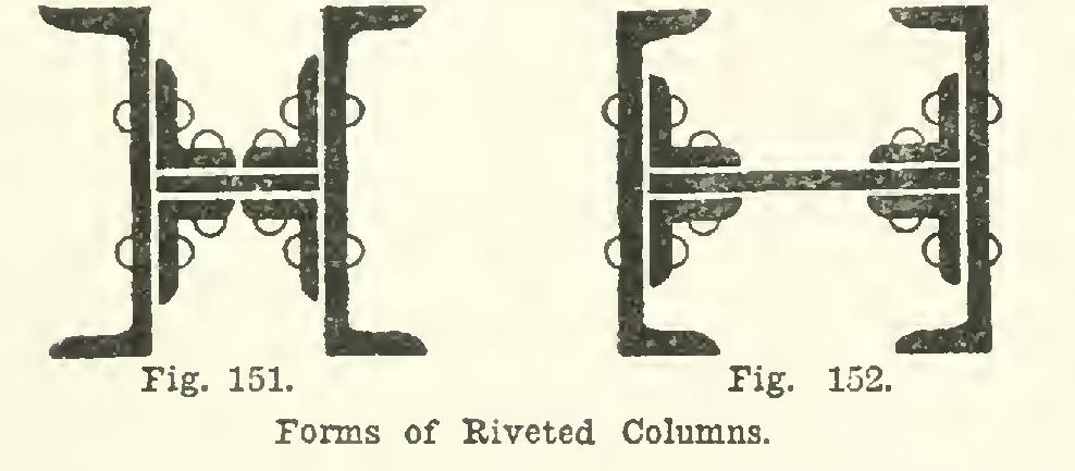 Solid and Members. The beams, girders, and columns may be of one piece, or composed of some of the elementary parts riveted together. Thus a beam or girder may be of the I-beam style, Fig. 141, in one solid piece; or it may be formed as in Fig. 146, of a plate and four angles riveted together.