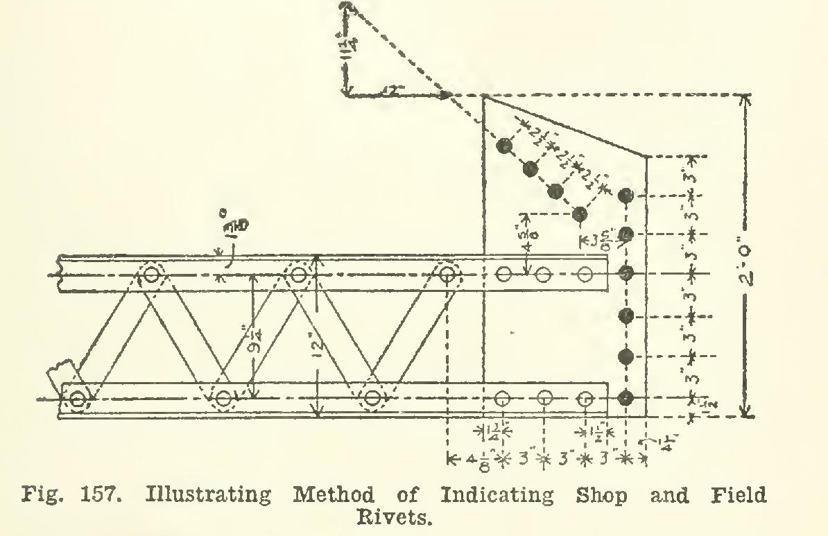 On the drawing, the rivets to be shop-driven are shown in position with the heads drawn; while for those to be riveted in the field, only the holes are shown, blacked in. This distinc tion is illustrated hi Fig. 157, which is taken from a working drawing of one end of a bridge strut. This strut is composed of four angles laced together, like the column shown in section in Fig. 145, two angles at the top, and two at the bottom. The blank circles at the ends of the lacing bars, and those at the ends of the angles, are the heads of the shop-driven rivets, while the black holes are for the rivets which are to be driven in the field. These latter rivets are those by which the strut is to be fastened in position.
