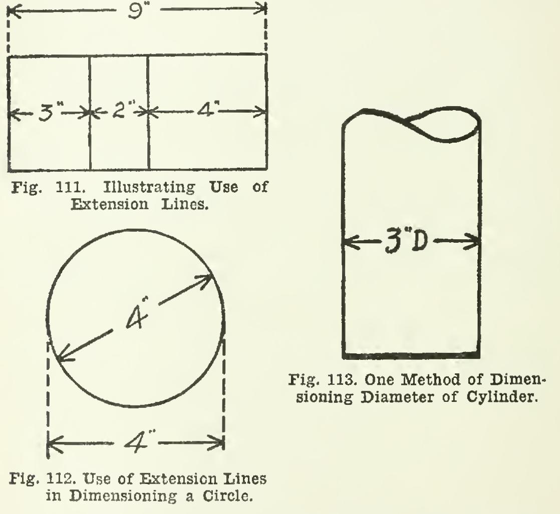 If, as in Fig. 113, the diameter of a rounded piece, as a cylinder, is given elsewhere than on the end view, the dimension figure should be followed by D or Dia. (for "Diameter").