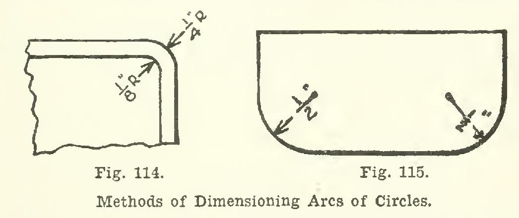 Where an arc of a circle is given, indicate the radius instead of the diameter, as shown in Figs. 114 and 115. Where there is sufficient room, the center of the arc should be enclosed in a small freehand circle, and the dimension placed between the center and the arc as in Fig. 115; otherwise the length of radius should be given as in Fig. 114, followed by the letter R to denote "Radius." When an arc is given, use only one arrow head.