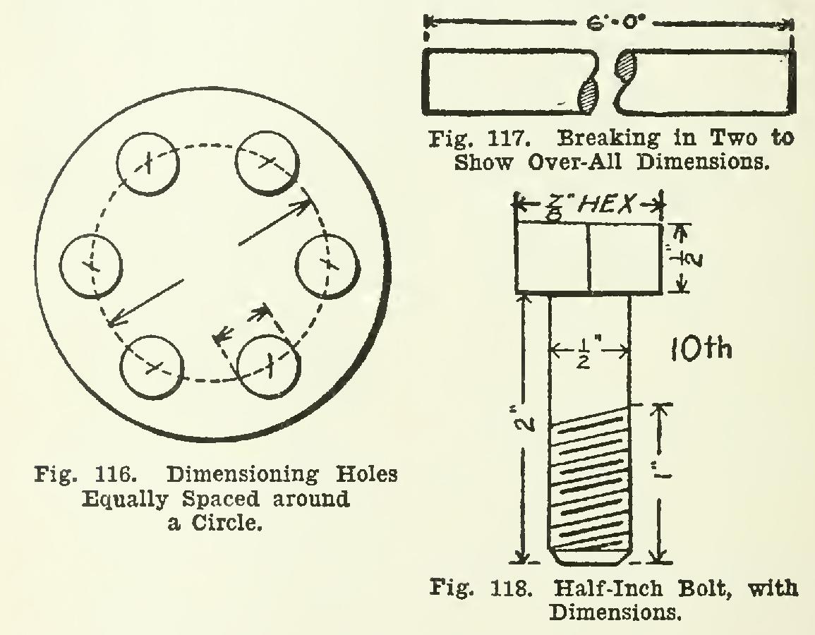 When a number of holes are equally spaced around a circle, give the diameter of circle pass ing through centers, as in Fig. 116. If the holes are all of equal size, it is sufficient to give the diameter of one or two.