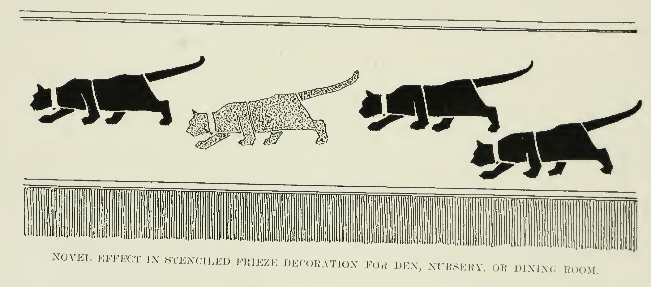 Next comes the frieze. As there is a rail round this room, the frieze can be hung now; if there were none, the filling would have to be hung first. Never hang a frieze in short lengths; hang the whole length from angle to angle in one piece; nothing looks worse than joints in a frieze. Trim on the board the whole length of the piece, and roll up as you trim. Begin on the chimney breast; arrange so as to get the same pattern on both sides, and allow enough to go around into the corners on the side of the breast; paste and fold in short folds, and hang. Con tinue till the place is reached where it is intended to make a break. In this case, the frieze space not being cut into by anything, and the door be ing in the corner, the best place will be the angle over the door, as being the part least likely to be noticed.
