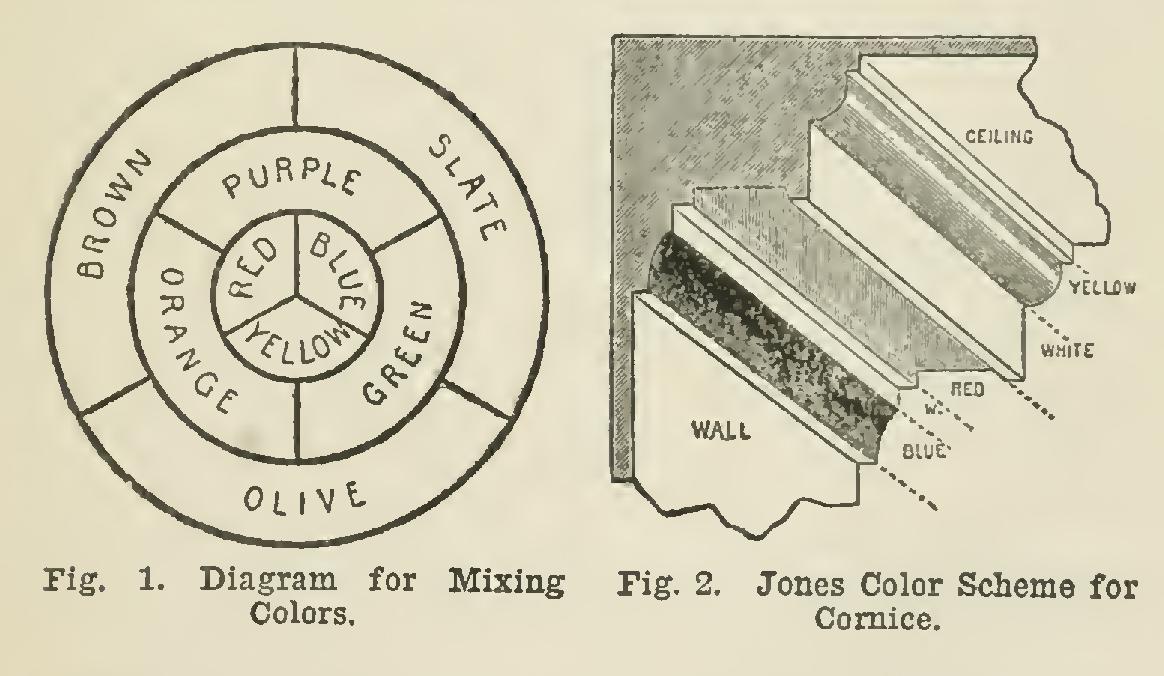 The primary pigments, being the first simple division, consist of blues, reds, and yellows. By combining chemically suitable blue and red, we obtain purple; with red and yellow we get orange; while blue and yellow pigments com bine to give us green colors. These resultant ad mixtures of any two primaries are termed sec ondary colors; and again by a similar process of mixing, in certain proportions, two of the sec ondary pigments together, we obtain the third distinct class into which we divide our colors— known as the tertiary colors.