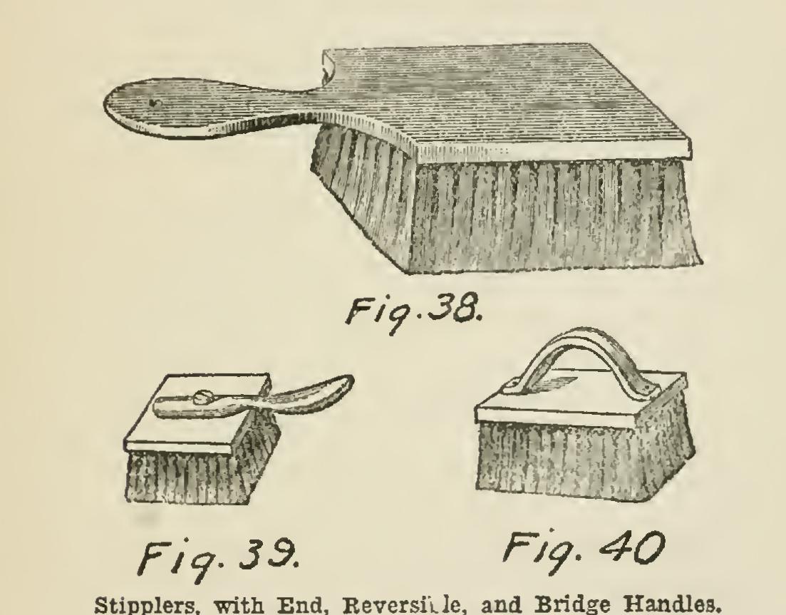 Stipplers are the most costly of painters' brushes. They are used for obliterating the brush markings, in "flatting" and other processes, by a beating action, executed evenly and carefully after the paint is applied and roughly distrib uted. They require careful attention to keep in order, and, directly after use, should be washed with plenty of soap and warm water, without wetting the "stock" or wood. When all the paint is removed, rinse in cold water, and ac celerate the drying by beating on a dry cloth or wash-leather. Fig. 38 shows a stipples with handle at end. Stipplers are also made with handles on the back and reversible handles. Fig. 39 has a reversible handle; Fig. 40 has a bridge handle. They are used for distributing paint or vehicles iu a perfectly regular manner, and for taking out paint-brush streaks. In use, the paint is first spread—a good coat—and then the work is at once stippled with the ends of bristles until a regular surface of a granular nature is obtained.