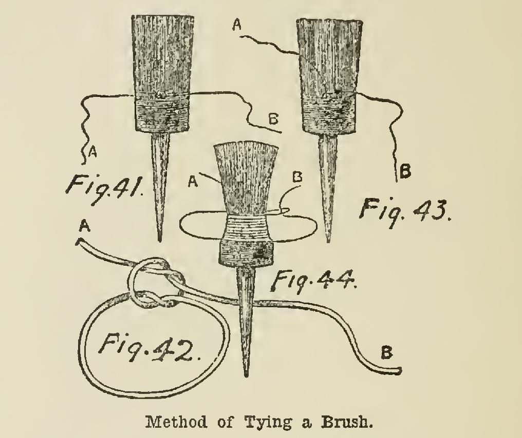 First tie a piece of stout twine around the brush, leaving 6 or 7 inches at one end (marked A in the sketch). Fig. 41 shows the first tie. Fig. 42 shows the form of knot used. The end A should be made to lie along the hair of the brush, Fig. 43, and the string should be coiled around it and the hair of the brush as many times as necessary. When enough has been wound around (Fig. 44), the cord marked B may be bent back, drawn close, and a half-knot made opposite the first knot. Both cords may now be fixed with small tacks to the stock or the handle of the brush, and the superfluous string cut off. The string need not be bound very tightly, for either paint or water will make it sufficiently tight for the purpose for which it is intended. From time to time, part of the string can be removed as the bristles wear away.