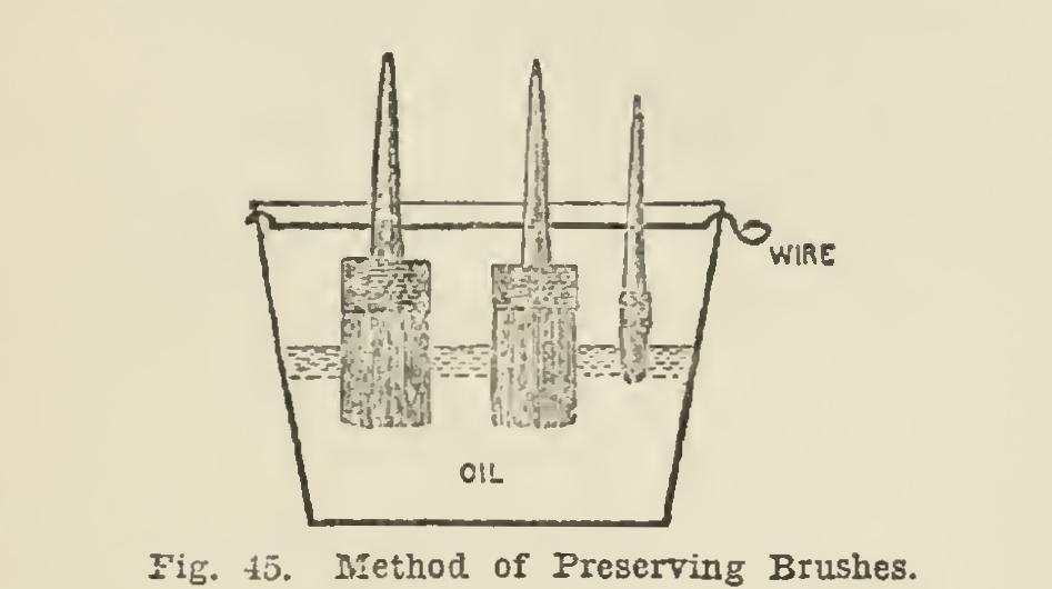 Pig. 45 shows a good method of preserving brushes. Clean out the brushes well, and make a hole in the handles to let the wire pass through, and then let them hang from the wire without touching the bottom; let them dip in linseed oil.