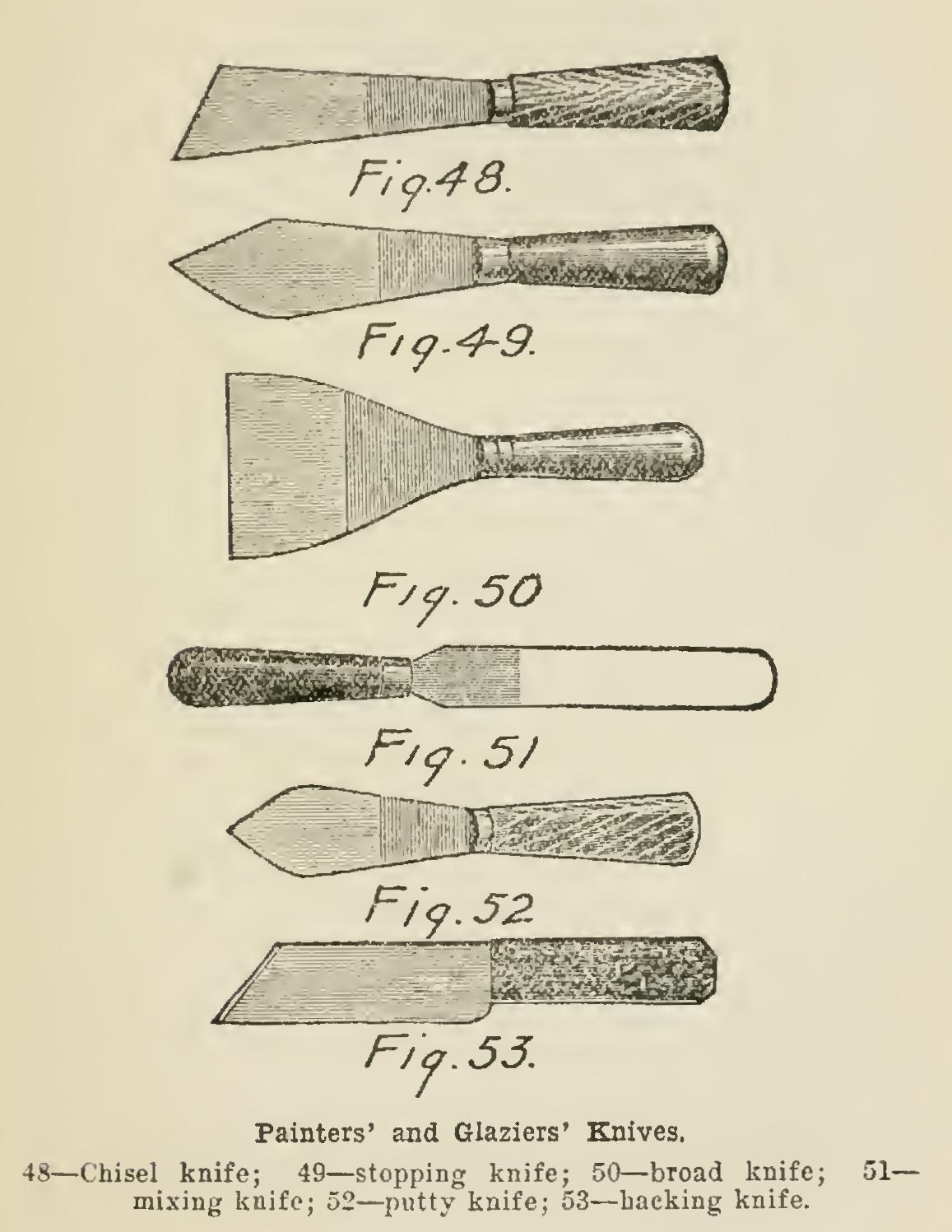 Five of the knives most used by the house painter are shown. Fig. 48 represents a chisel knife; or it may be termed a stopping knife with chisel point. Fig. 49 shows the most useful shape of stopping knife, with which holes and indentations in woodwork, etc., are filled with putty. Fig. 50 is the chisel knife proper, but as often termed the broad knife; this is used for stripping and scraping old walls, filling up wood work, stopping plaster walls, etc., and is a very useful tool. Fig. 51 is a knife having a thin steel blade; it is used for mixing paints on a slab. Fig. 52 and Fig. 53 are more properly glaziers' knives than house painters'; the first is the putty knife, indispensable for glazing sashes; and the latter the hacking knife, for use with a hammer for chipping out the old, hard putty previous to re-glazing.